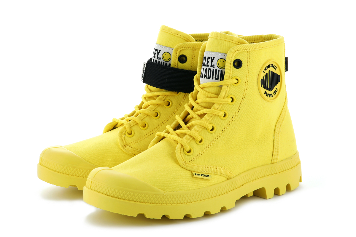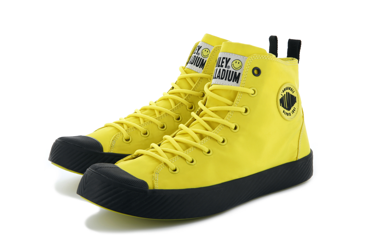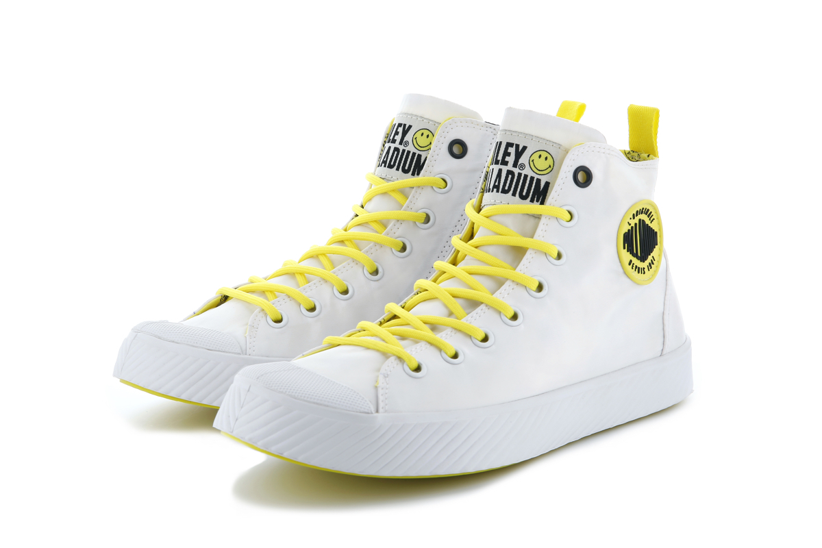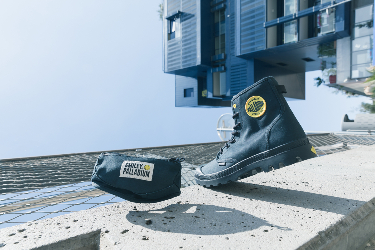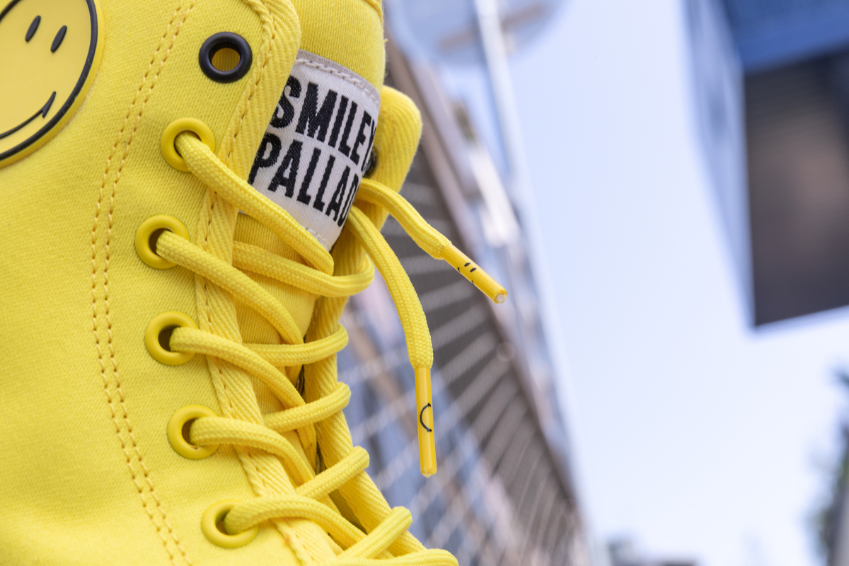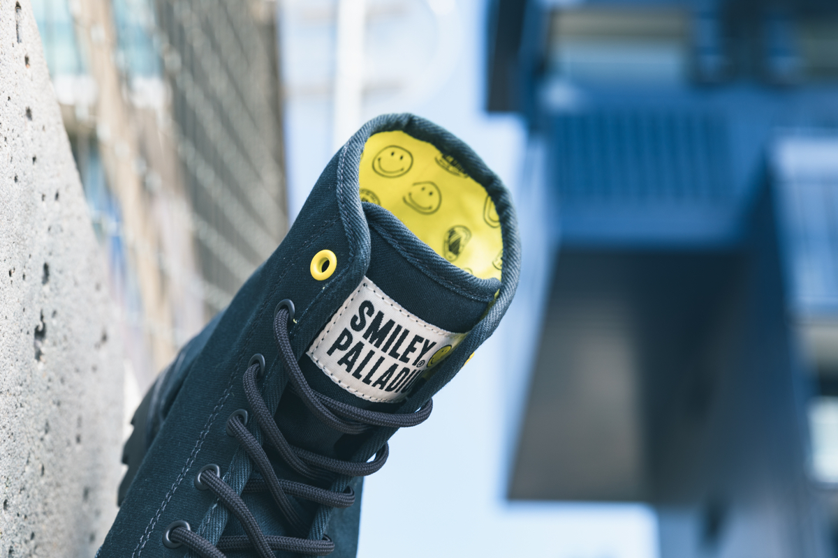 両モデルともに、右足のアウトサイドにスマイリー、左足のアウトサイドにパラディウムのロゴワッペンを取り付け、シューズのインサイドには、ふたつのロゴマークをプリント。シューレースの先端ではスマイリーが笑うようにデザインを施し、シューホールの一番上だけカラーを変えるなど、細部にも笑顔が生まれる一足に仕上げました。