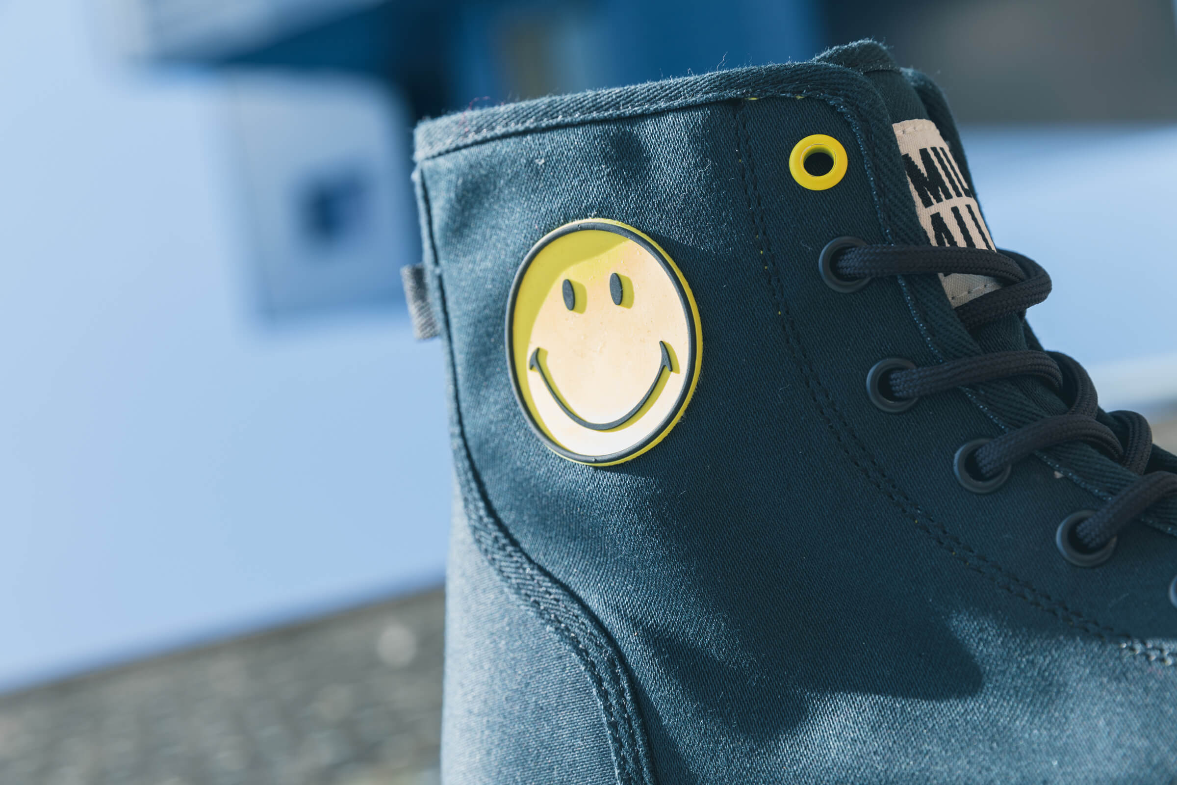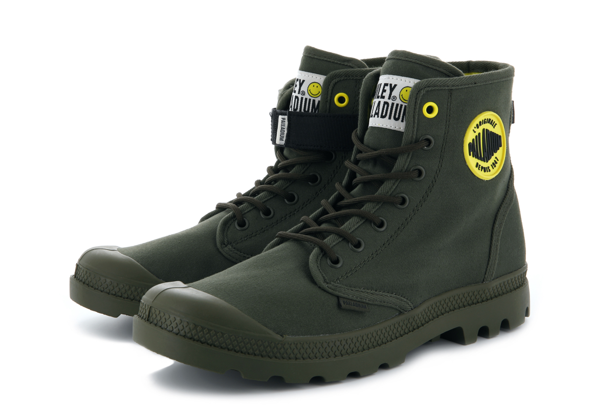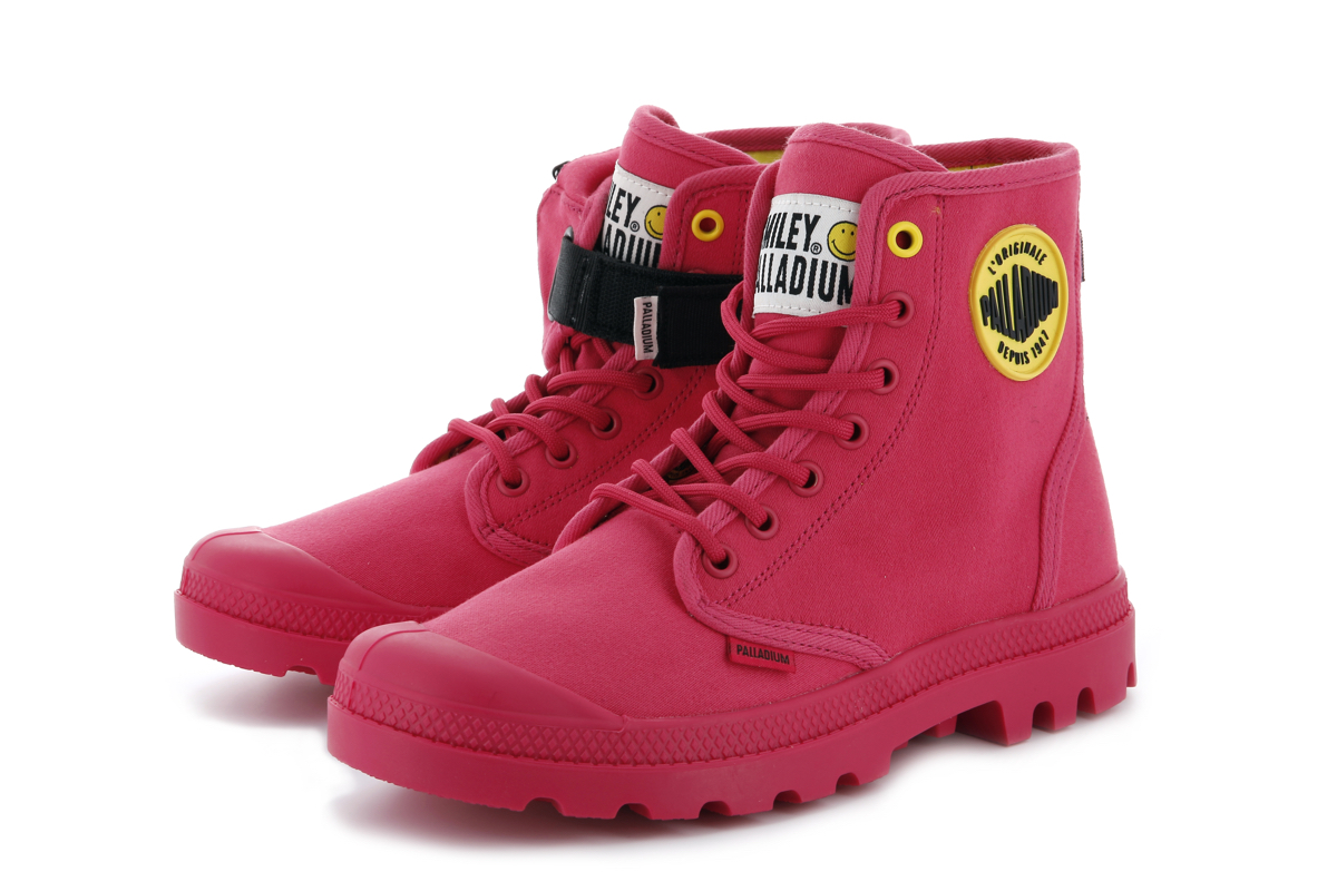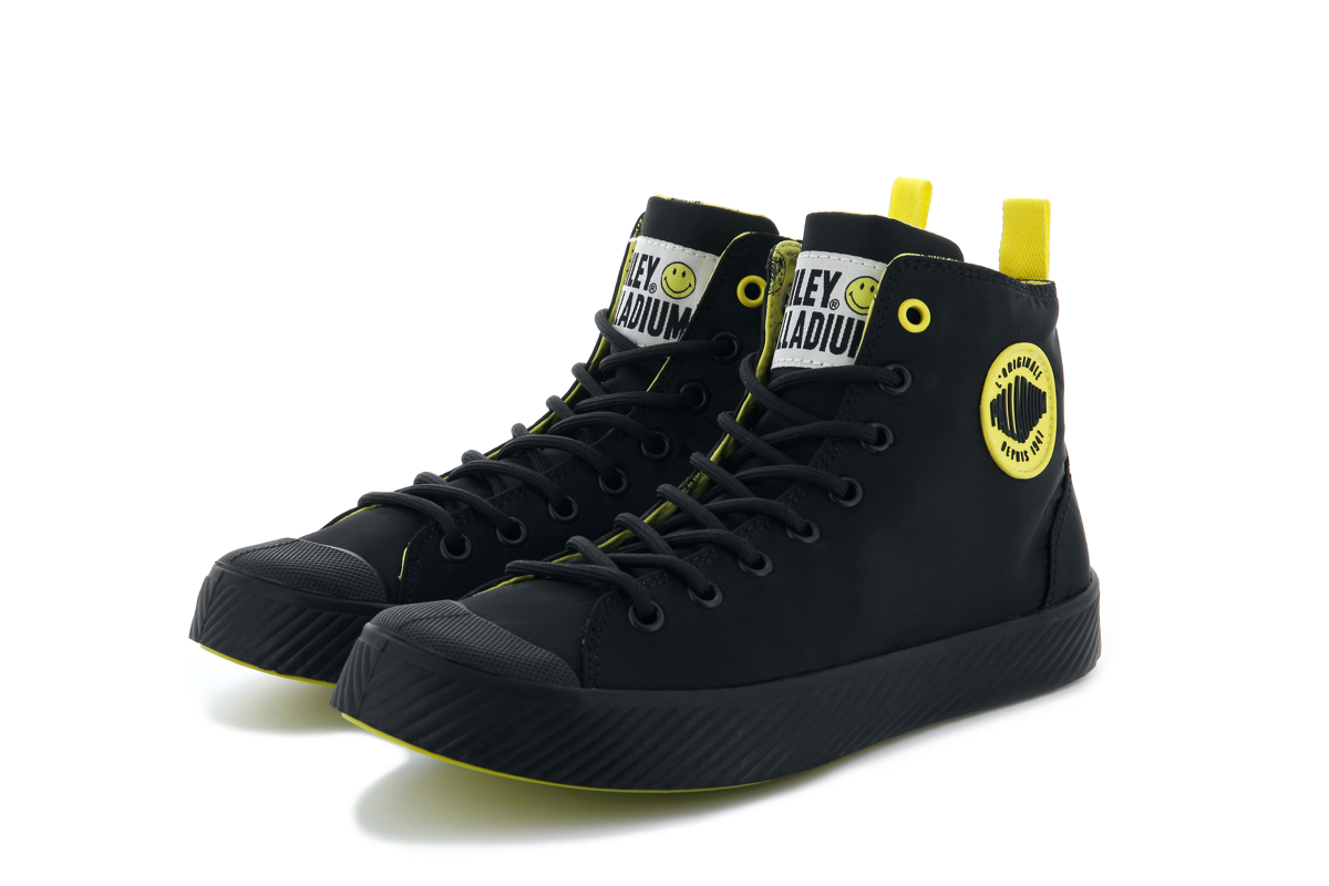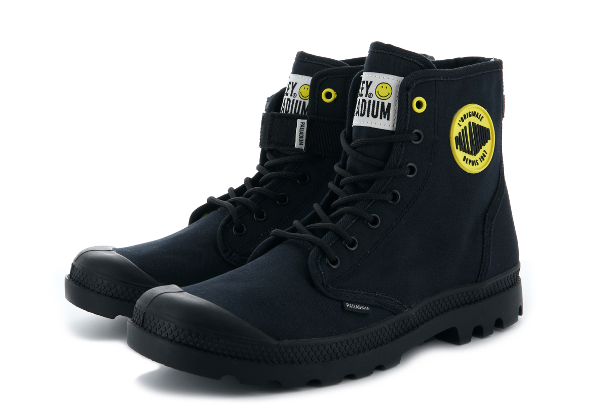 両モデルともに、右足のアウトサイドにスマイリー、左足のアウトサイドにパラディウムのロゴワッペンを取り付け、シューズのインサイドには、ふたつのロゴマークをプリント。シューレースの先端ではスマイリーが笑うようにデザインを施し、シューホールの一番上だけカラーを変えるなど、細部にも笑顔が生まれる一足に仕上げました。