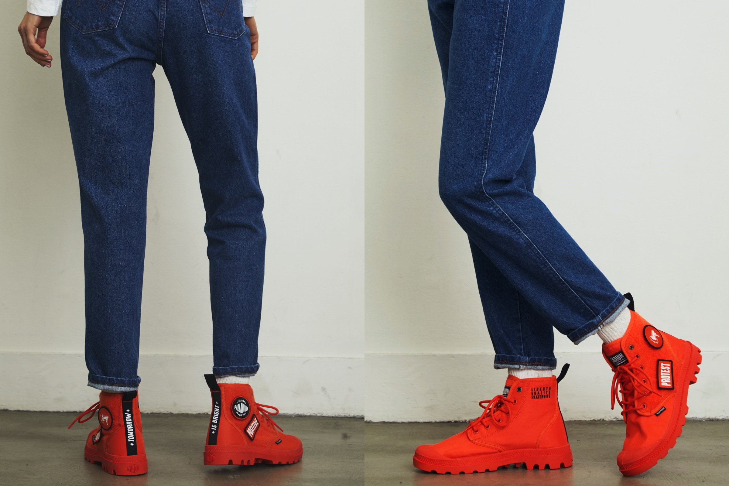 アッパー内側に自由・平等・友愛という、フランス革命期のスローガン。「PROTEST」や「POSITIVE」のテキストラインに、取り外しが可能な団結、連携、抵抗を象徴するイラストがデザインとなりカスタマイズできる。アッパーには、柔らかいモールスキンのキャンバスアッパーを採用し、快適な履き心地。