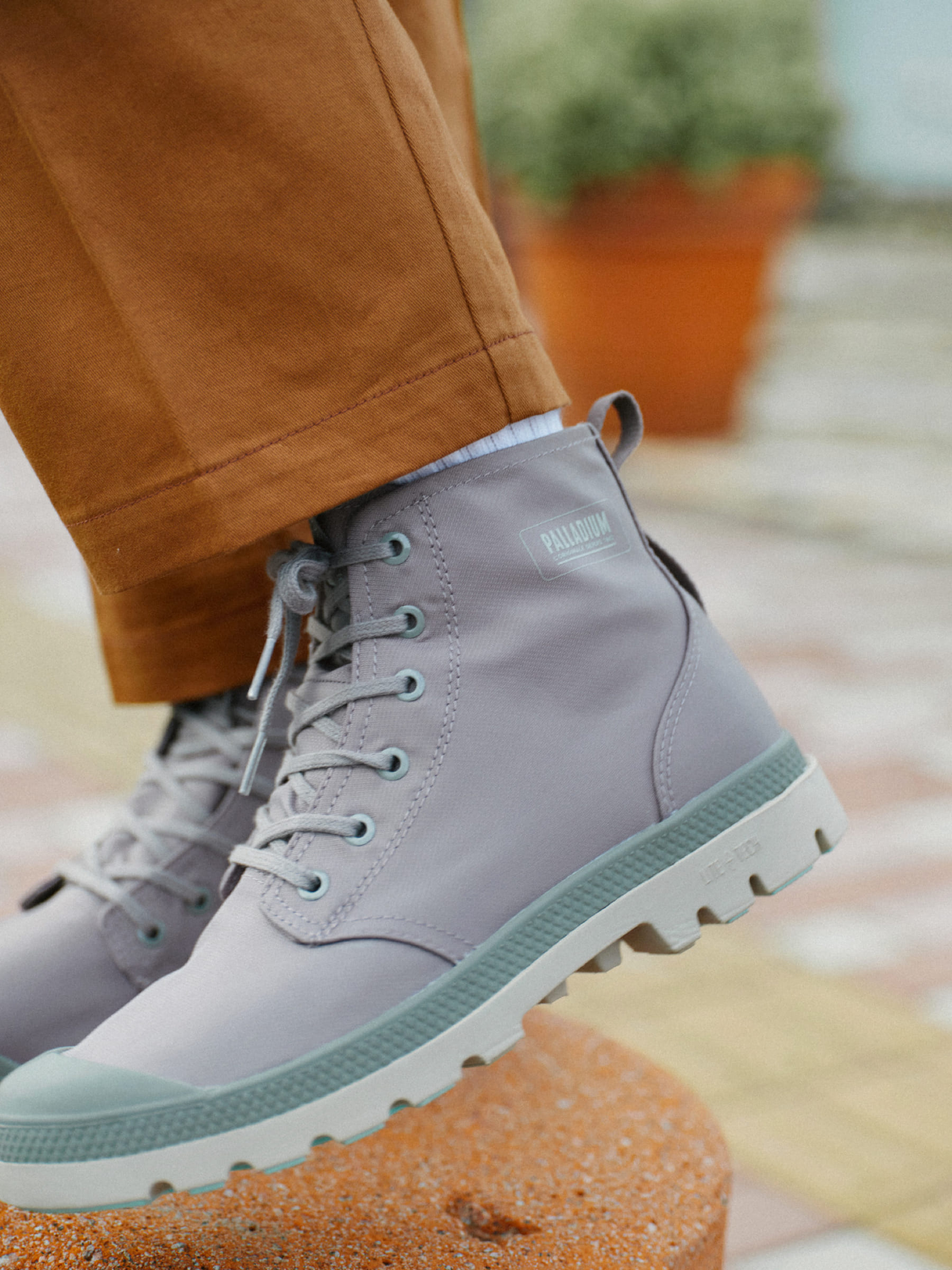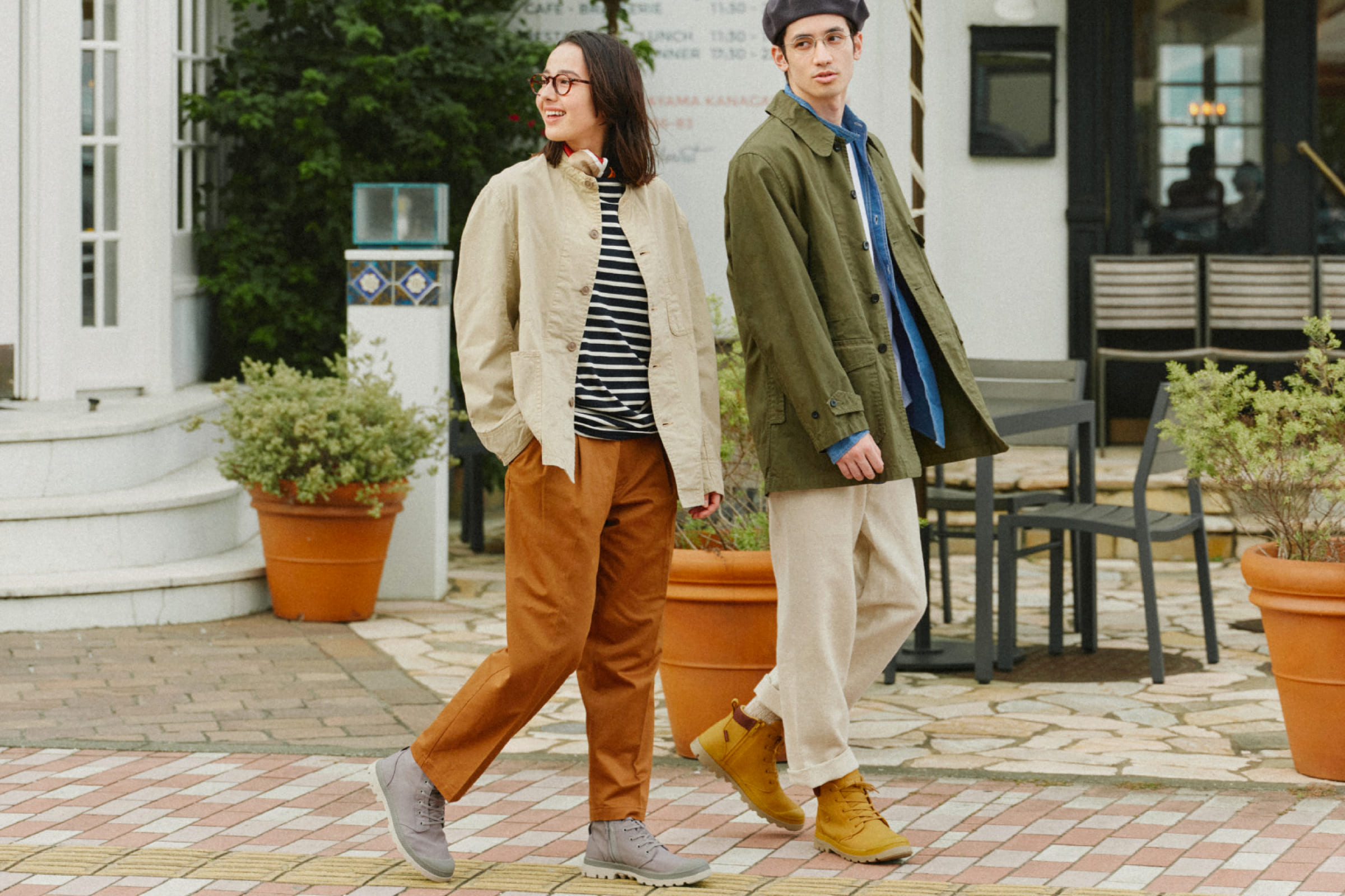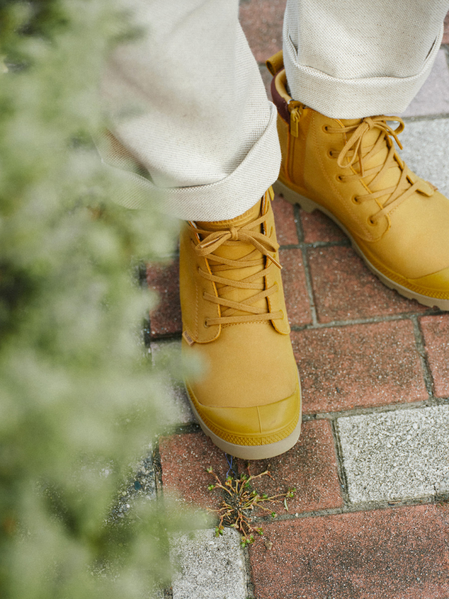 シューズブランドとしての歴史を1947年にスタートさせたPALLADIUM(パラディウム)。雑誌『2nd』とのタイアップ3回目は、街並みに溶け込んだフォトシューティング。防水機能が強調されがちなパラディウムブーツの都市での履きこなし提案に。