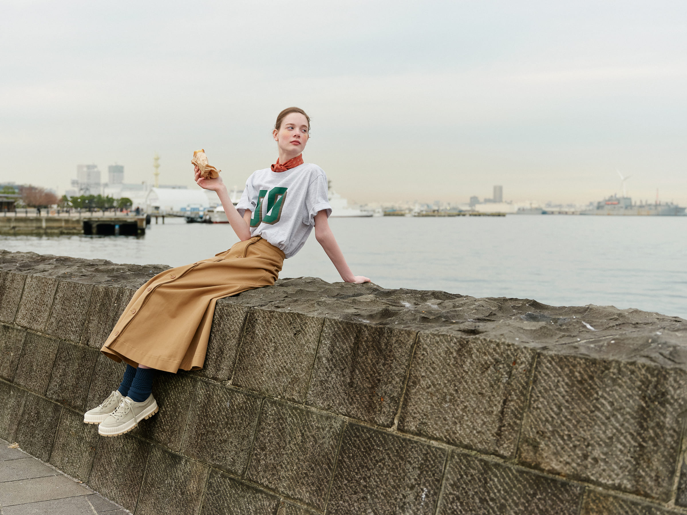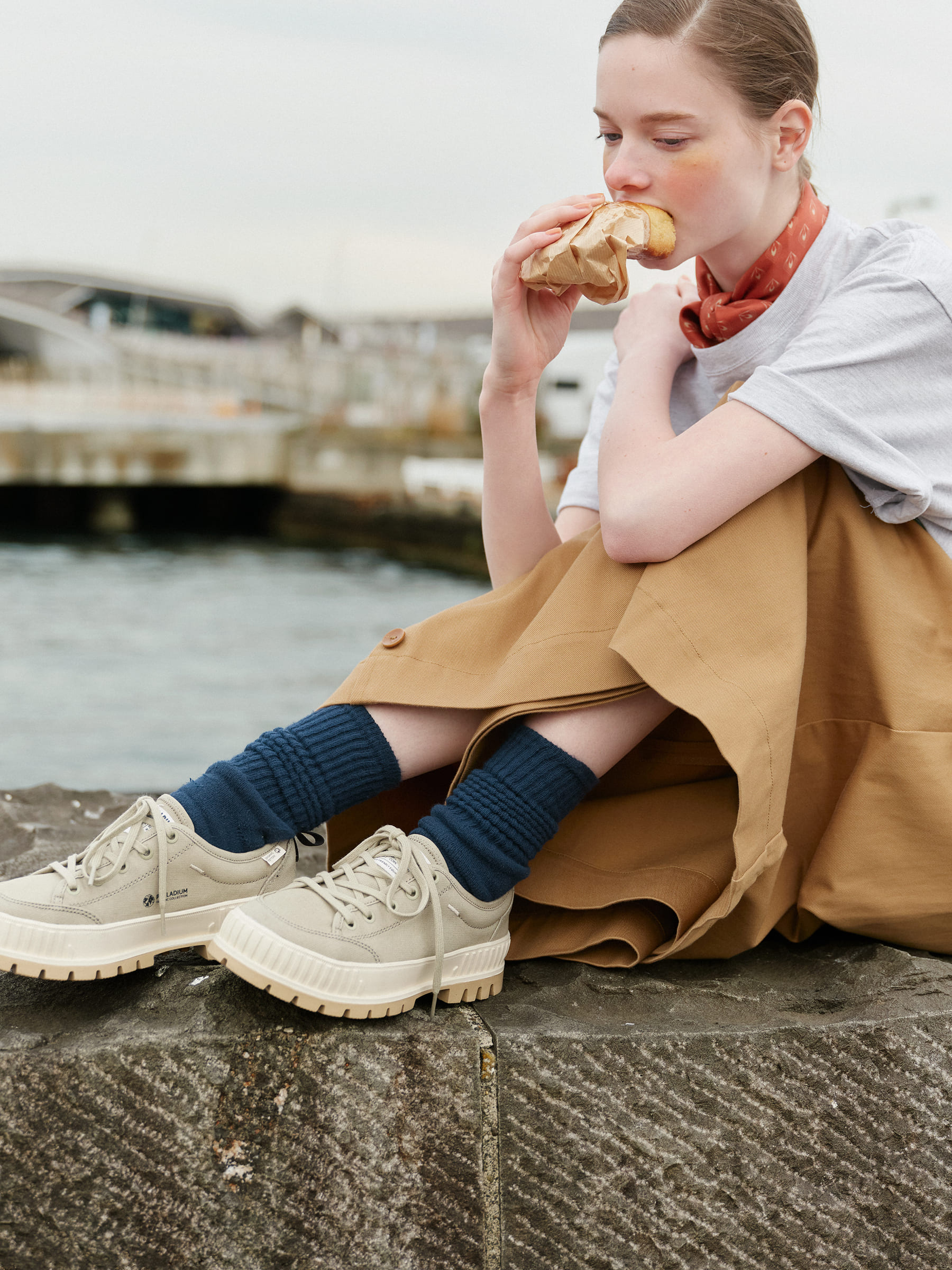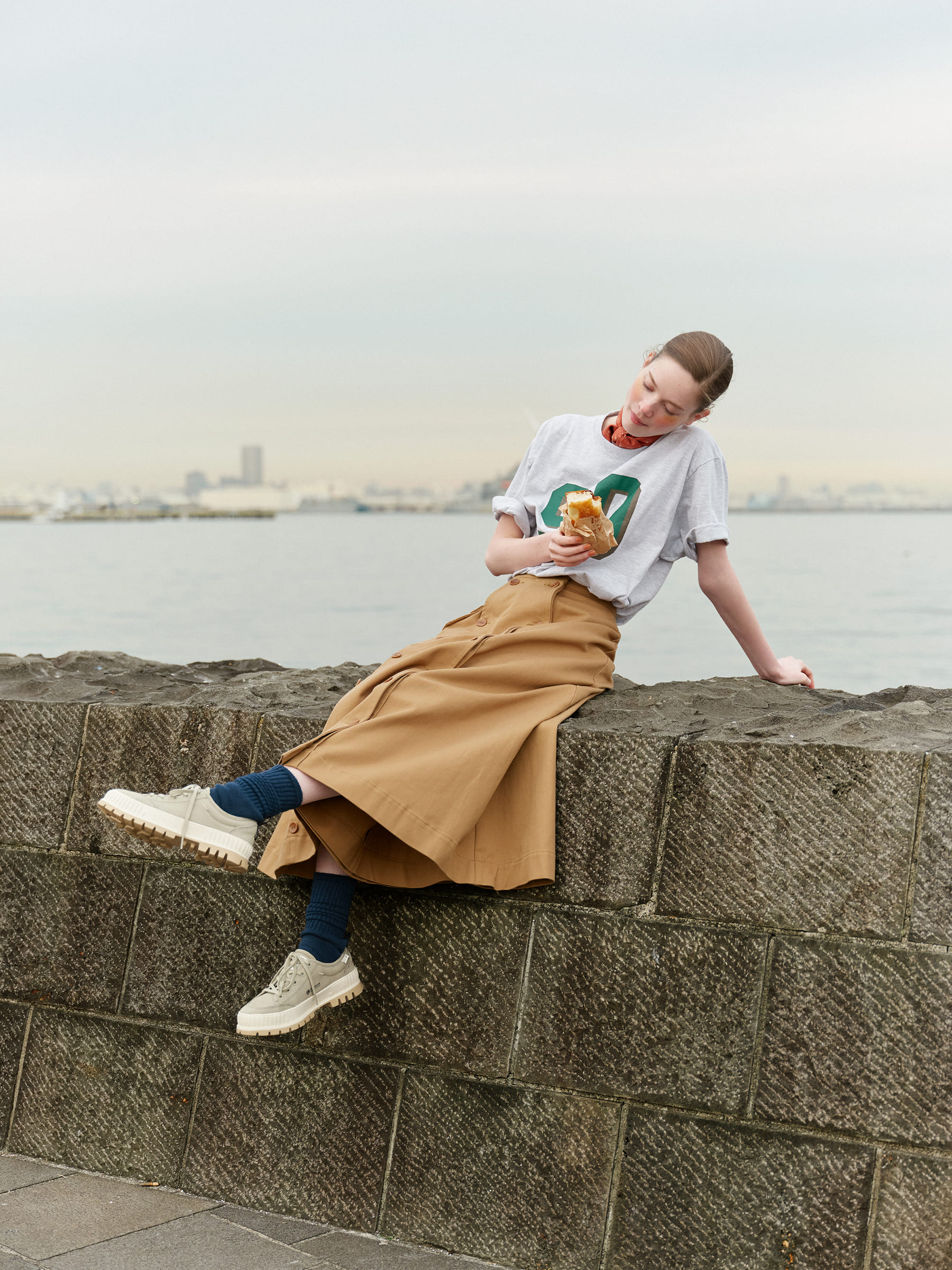 そんなエコロジーなアイテムを夏コーデの足元に採用。愛らしいフォルムと厚底ソールが特徴のスニーカーは、プリントTシャツやチノ素材など、カジュアルなアイテムとの相性も◎。シルクスカーフとマキシ丈のスカートを選べば、カジュアルでも、女性らしい品のよさをキープできます。