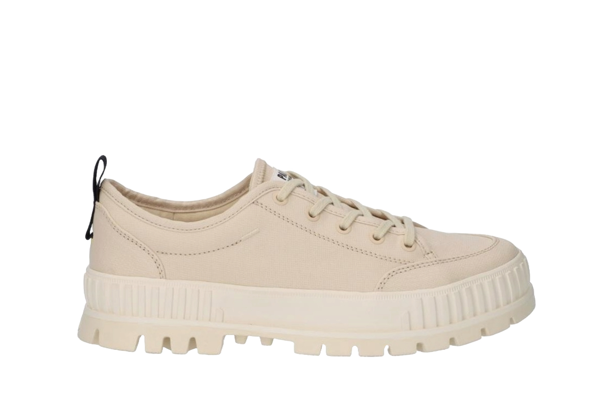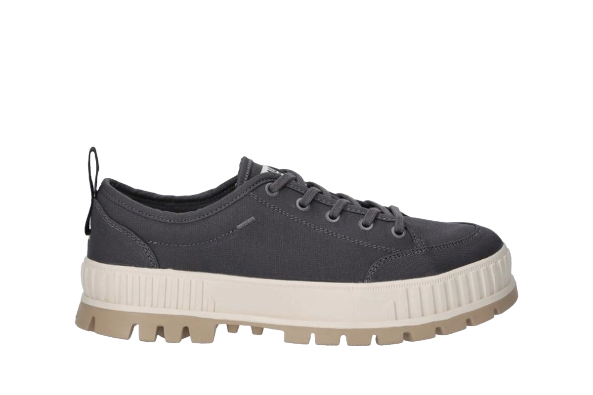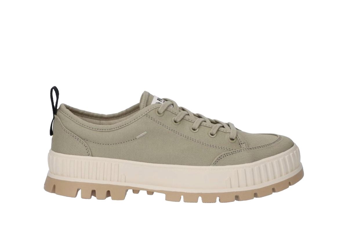 パラディウムの遺伝子を組み込んだ厚底タイプのローテクスニーカーに、有機栽培のオーガニックコットンを使用したキャンバス素材を採用。アウトソールやライニング、ソックライナーなど各部材はリサイクル素材を使っています。