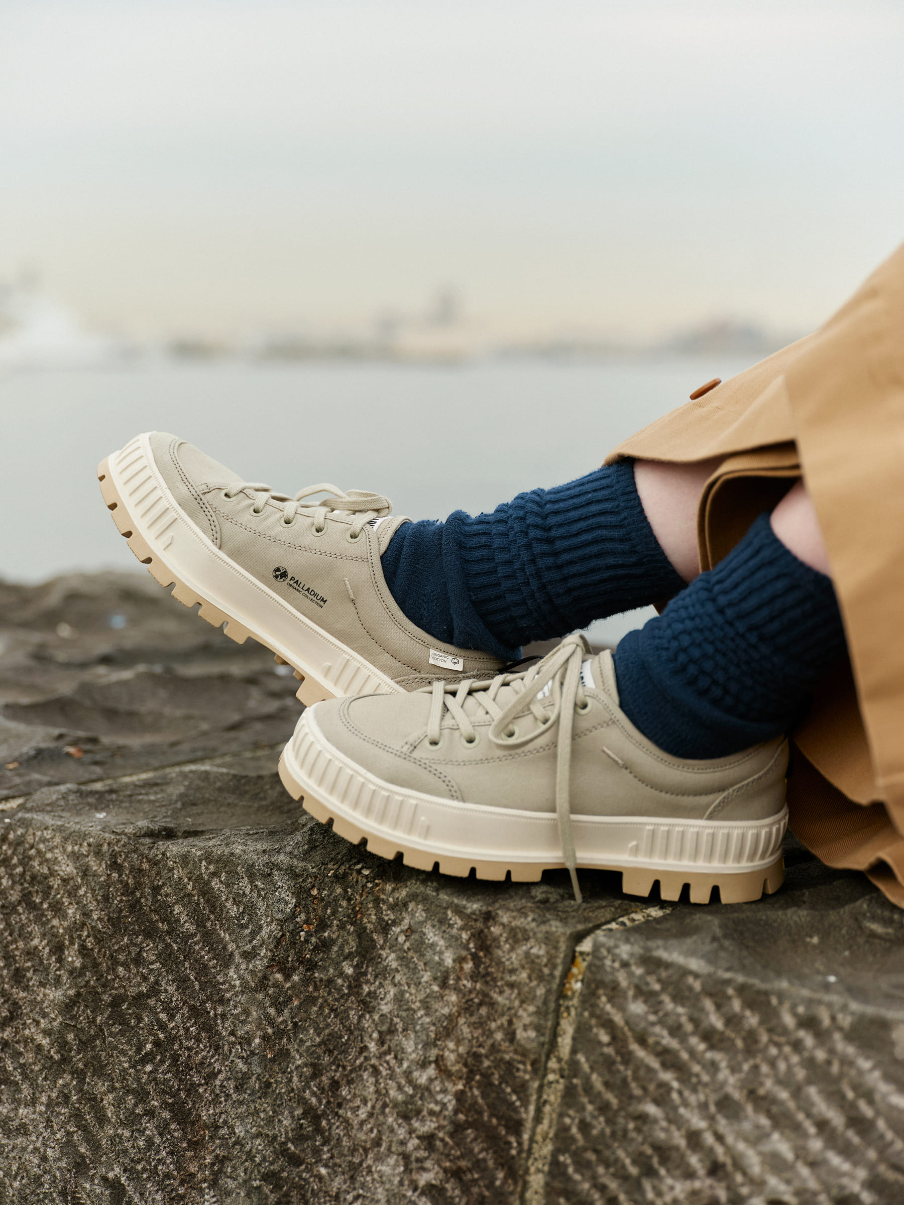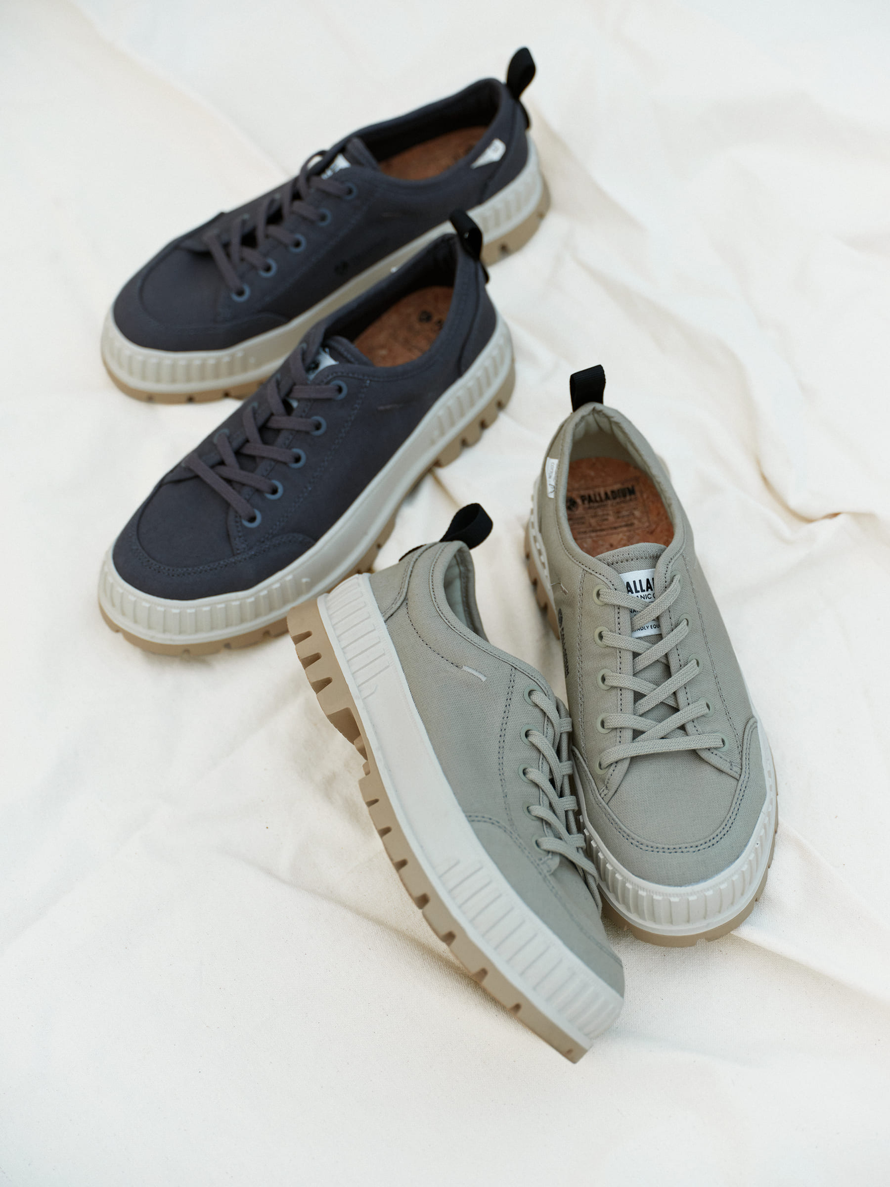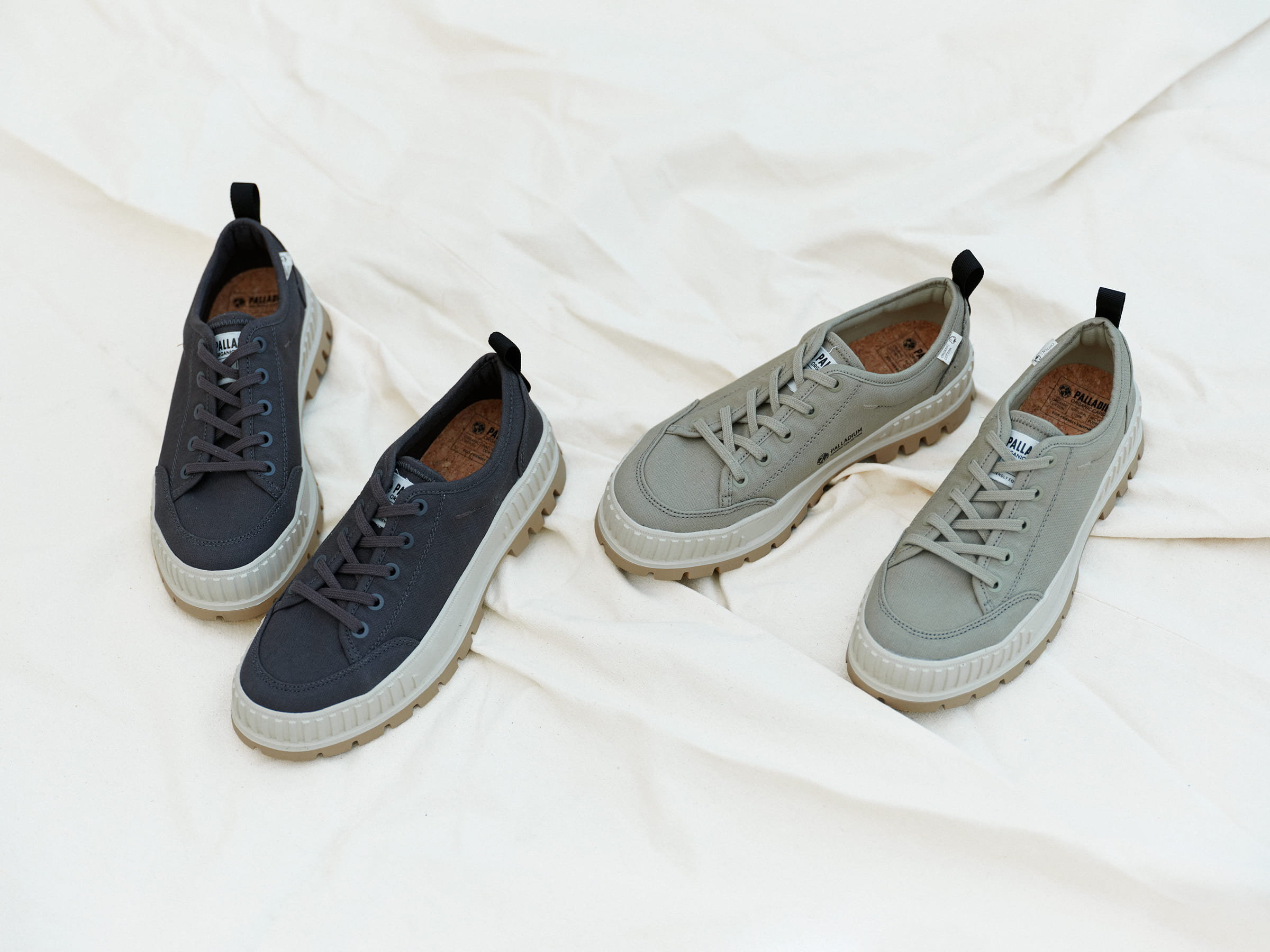 パラディウムの遺伝子を組み込んだ厚底タイプのローテクスニーカーに、有機栽培のオーガニックコットンを使用したキャンバス素材を採用。アウトソールやライニング、ソックライナーなど各部材はリサイクル素材を使っています。