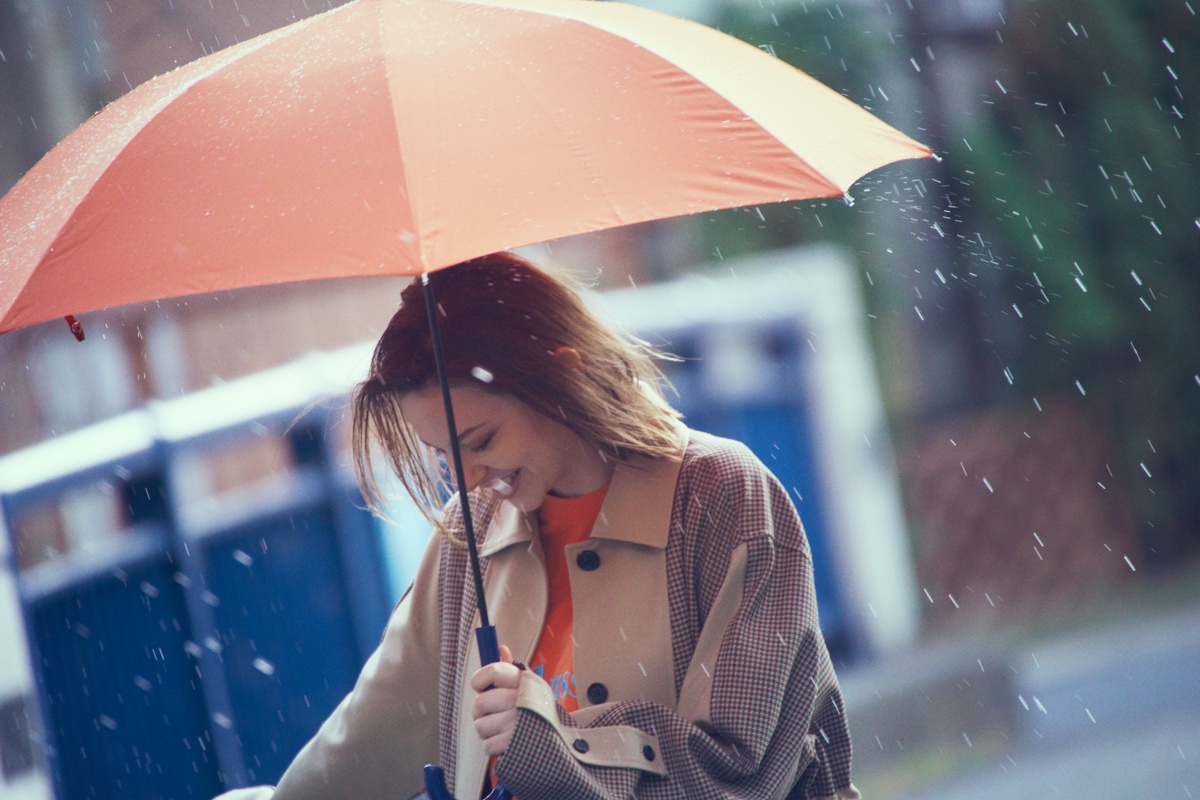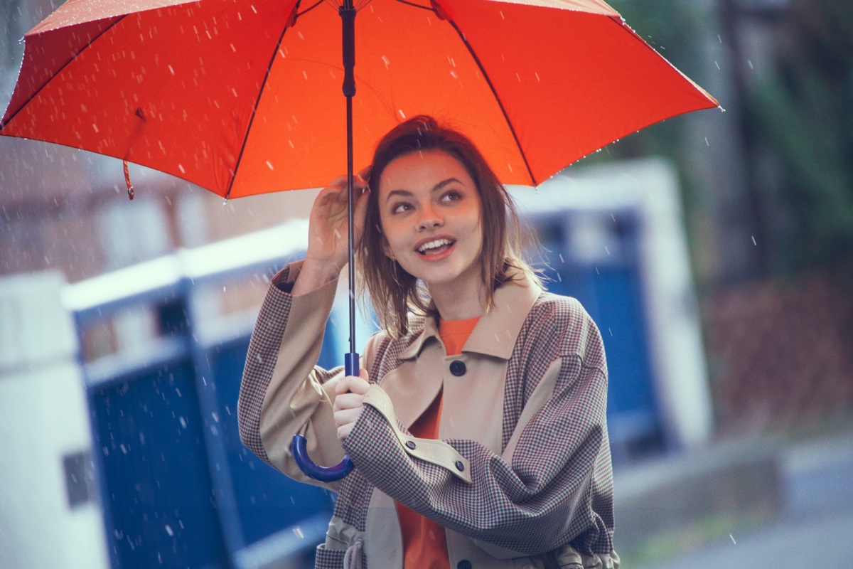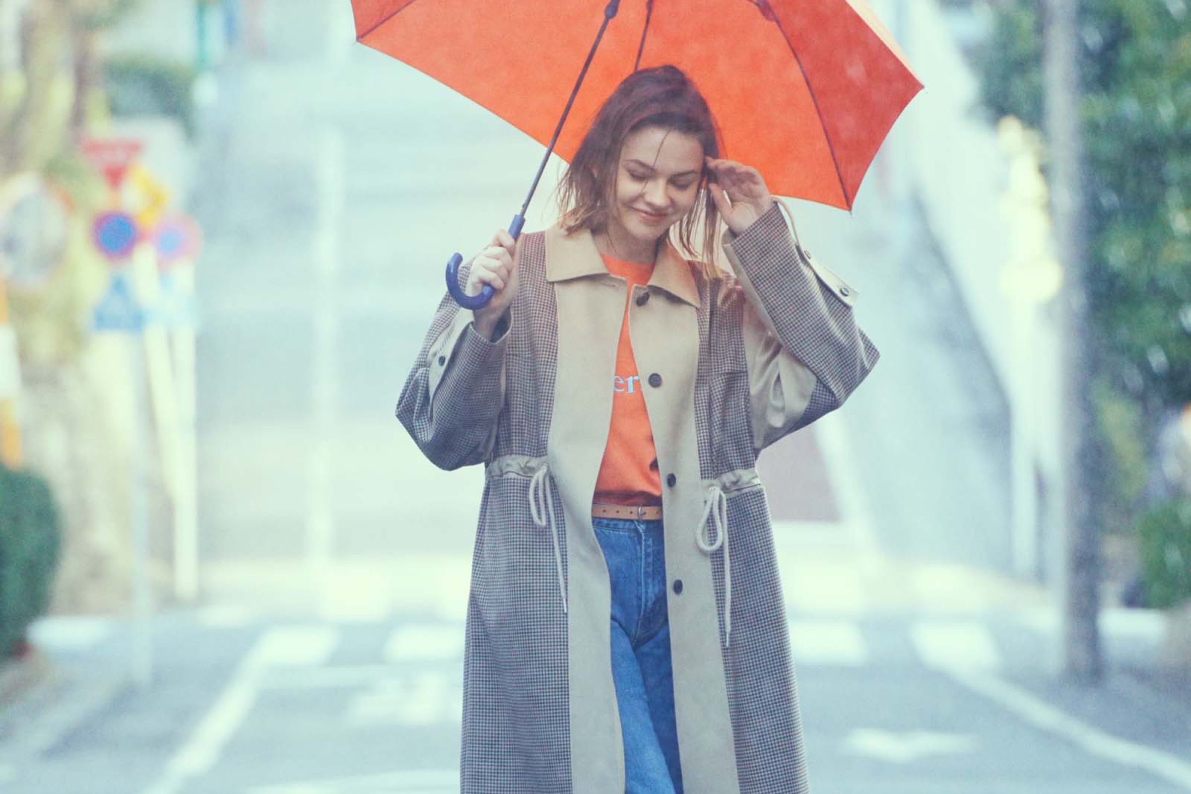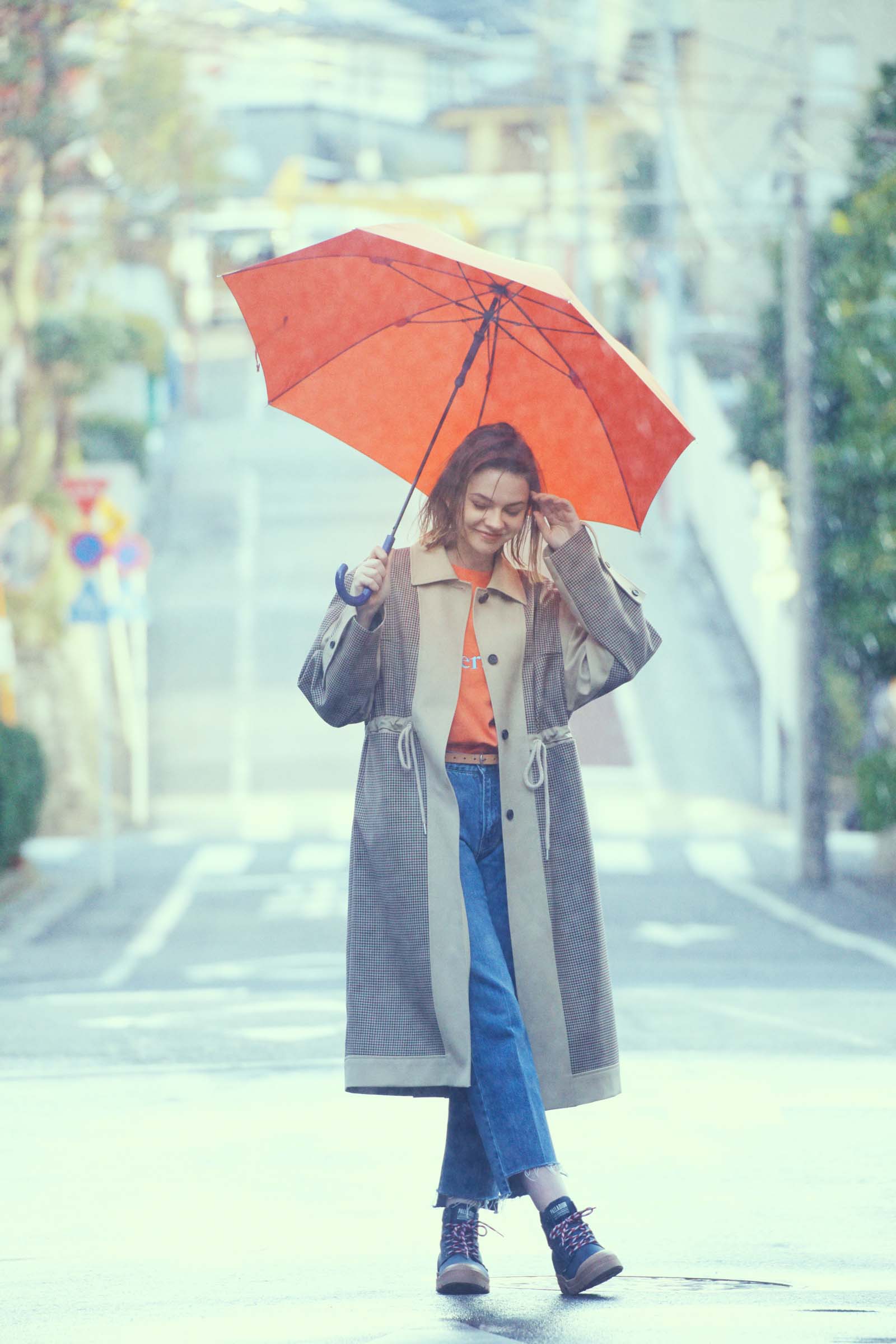 気分が落ちる雨の日は、あえて傘とコートのインナーカラーを合わせてアクティブに。レッド×ホワイトのシューレースもさりげないポイント。