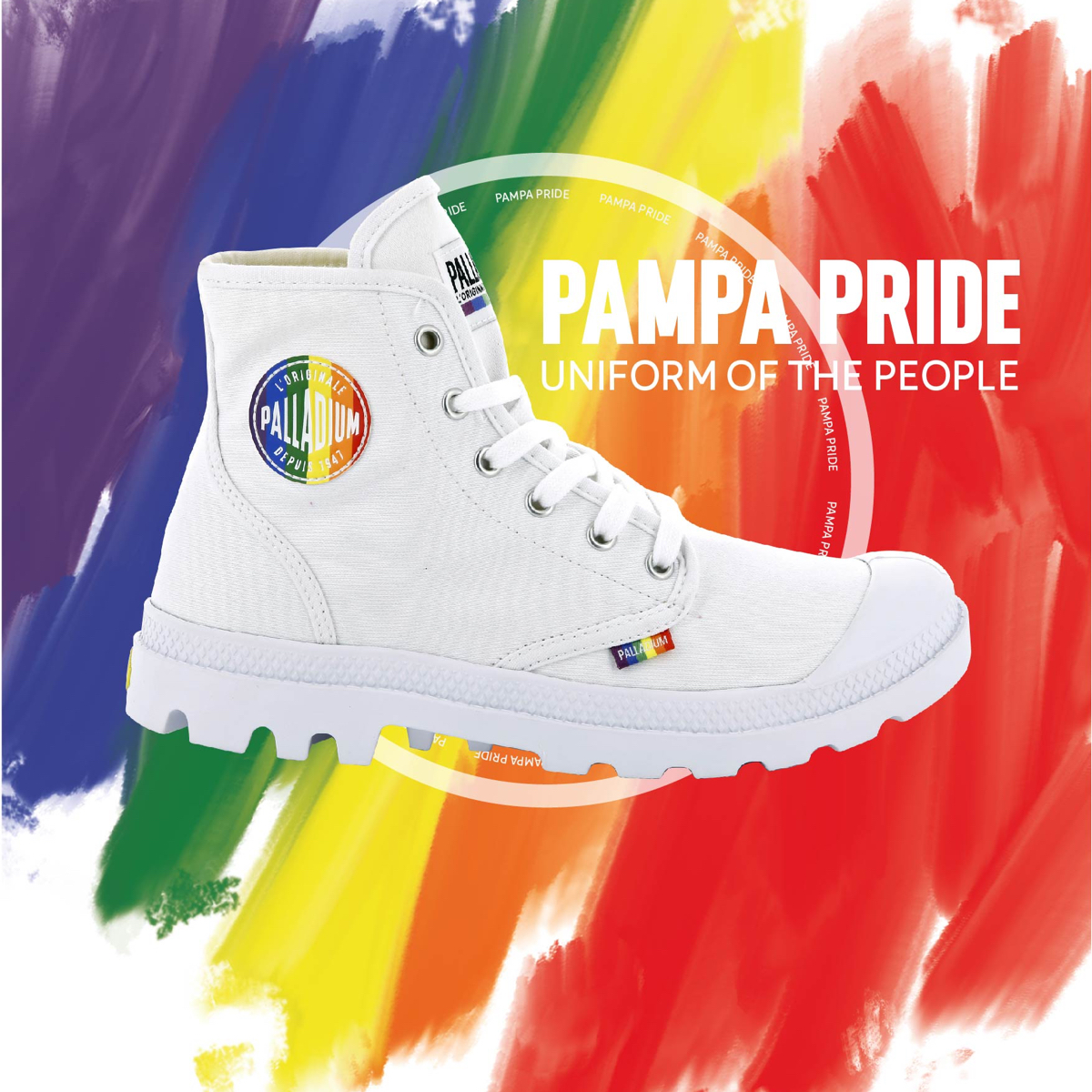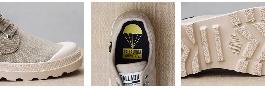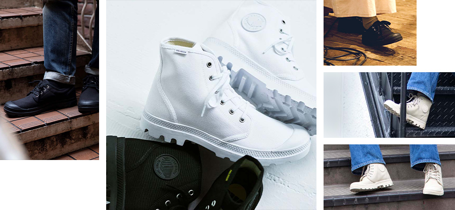 1947年当時、フランス軍から「砂漠地帯で使用するための快適で耐久性に優れたシューズを作ってほしい」という依頼を受けて、完成したのがキャンバスブーツ「pampa」シリーズ。70年の歴史を経た今も履き継がれ、特徴的なアウトソール形状は、パラディウムのアイコンに。