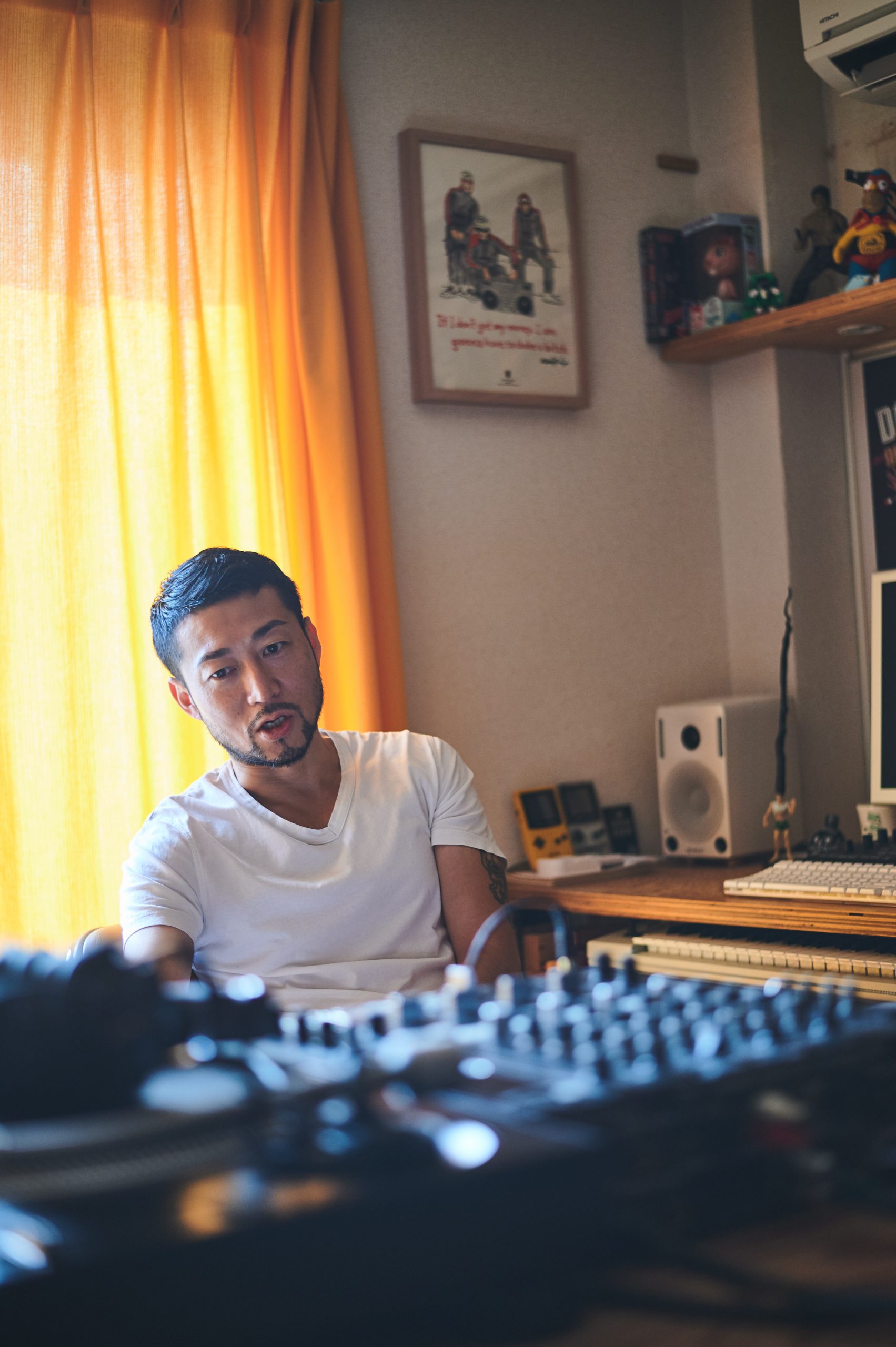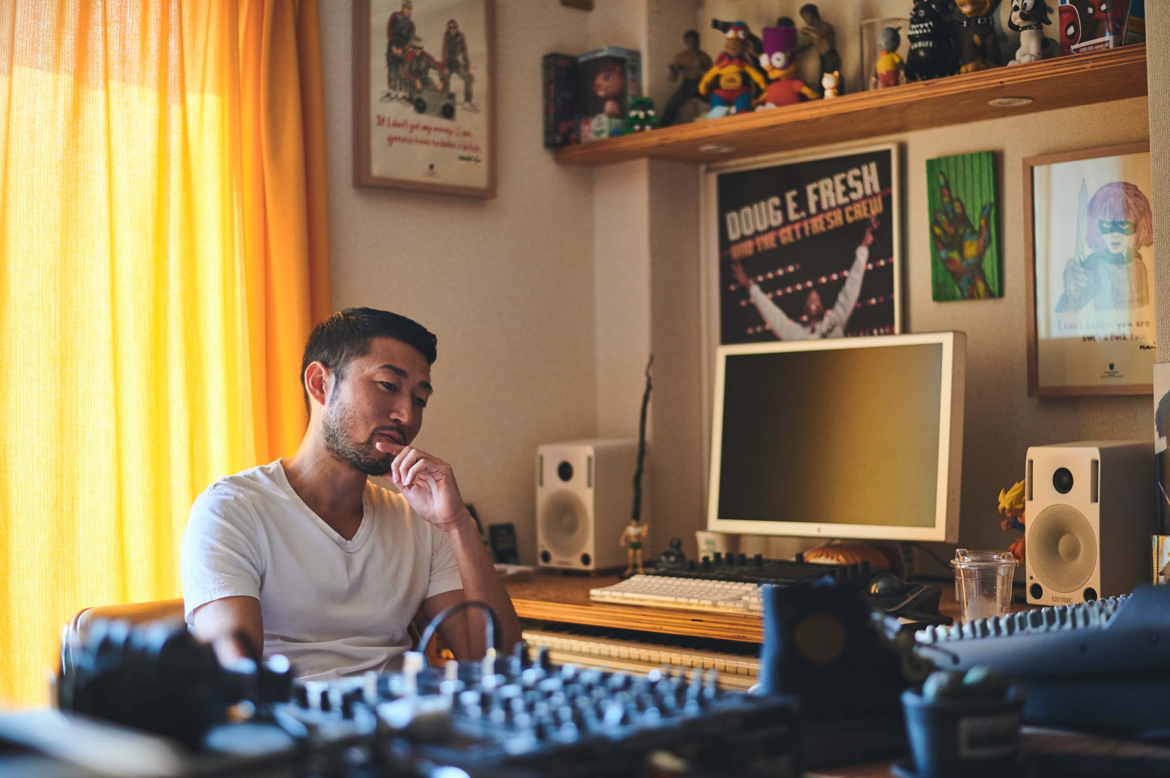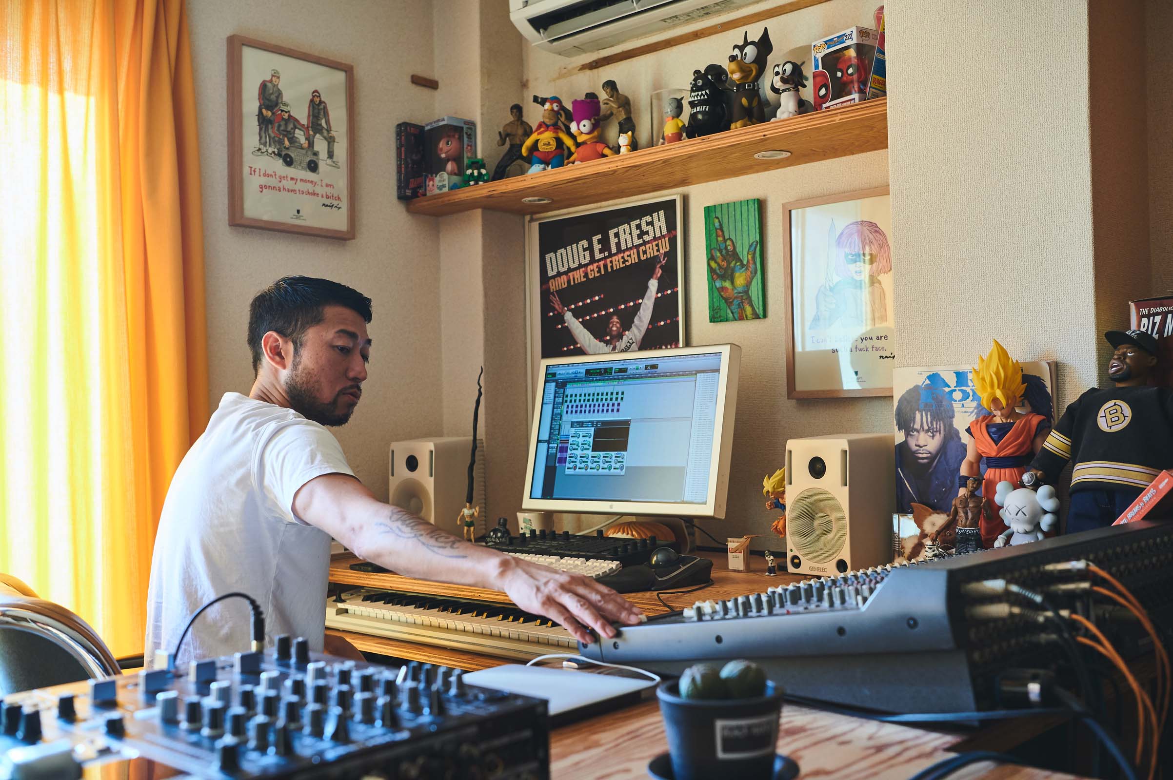『俺が高校を卒業した90年のころは、ちょうどHIPHOPのサウンドが多様に進化しはじめる時期だったんです。いわゆるニュースクール時代に入る。De La SOUL(デ・ラ・ソウル)、A Tribe Called Quest(ア・トライブ・コールド・クエスト)、Jungle Brothers(Jungle Brothers)は自分にとってはアイドルですよ。そのくらいからサンプリングの技法も、曲に乗せるメッセージもガラッと変わってくる。そういったHIPHOPの音楽性に衝撃を受けるようになって、DJをやりだすんです』