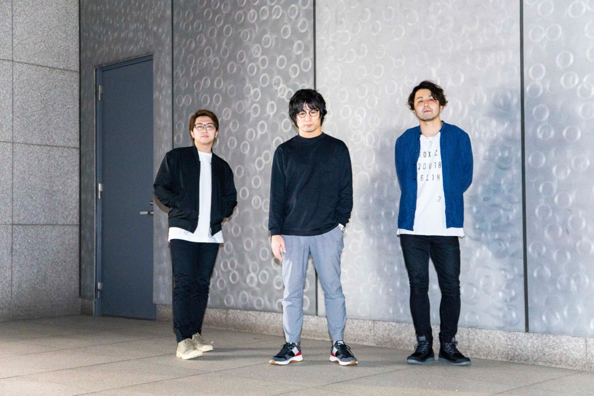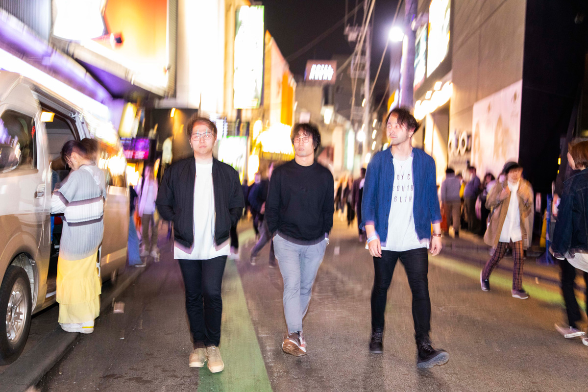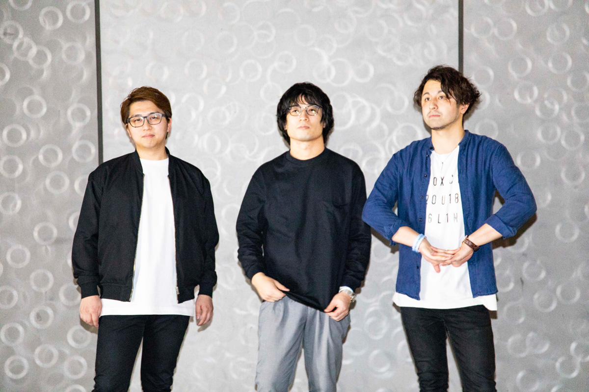 [L→R] カワイヒデヒロ(Ba.) / 岸本亮(Pf.) / 井上司(Dr.)