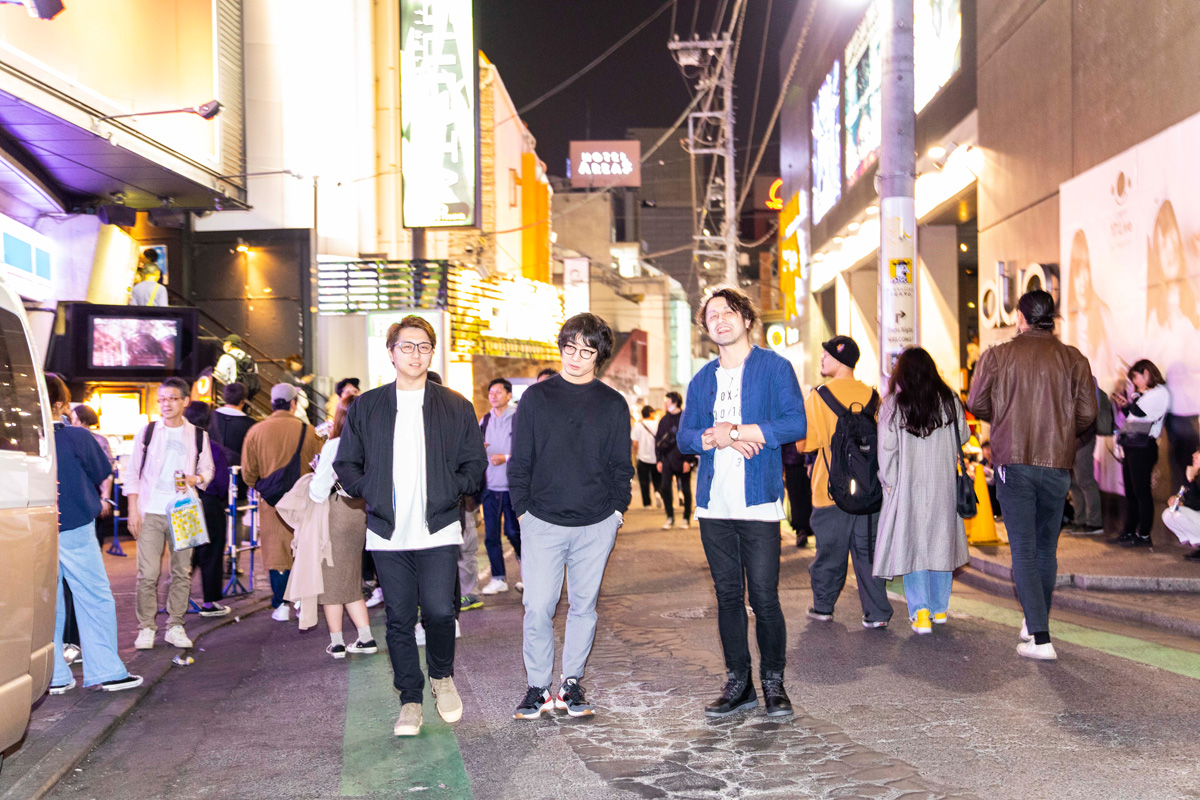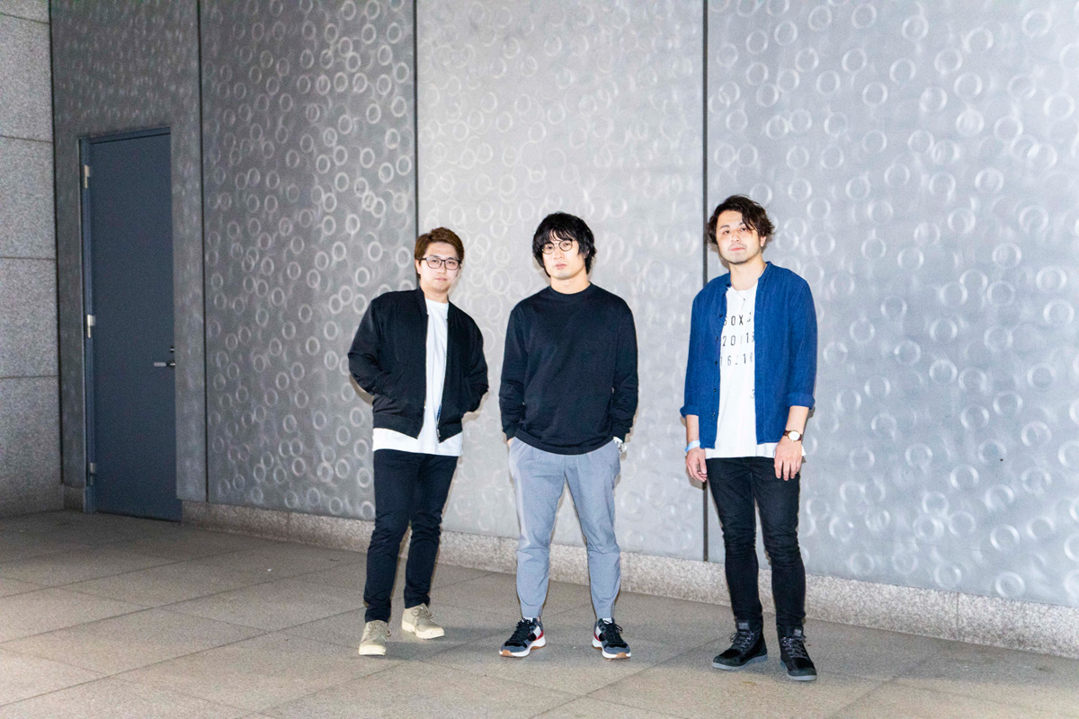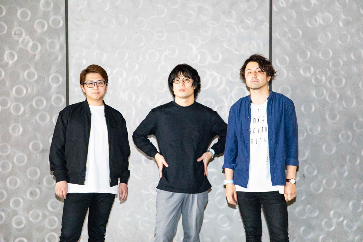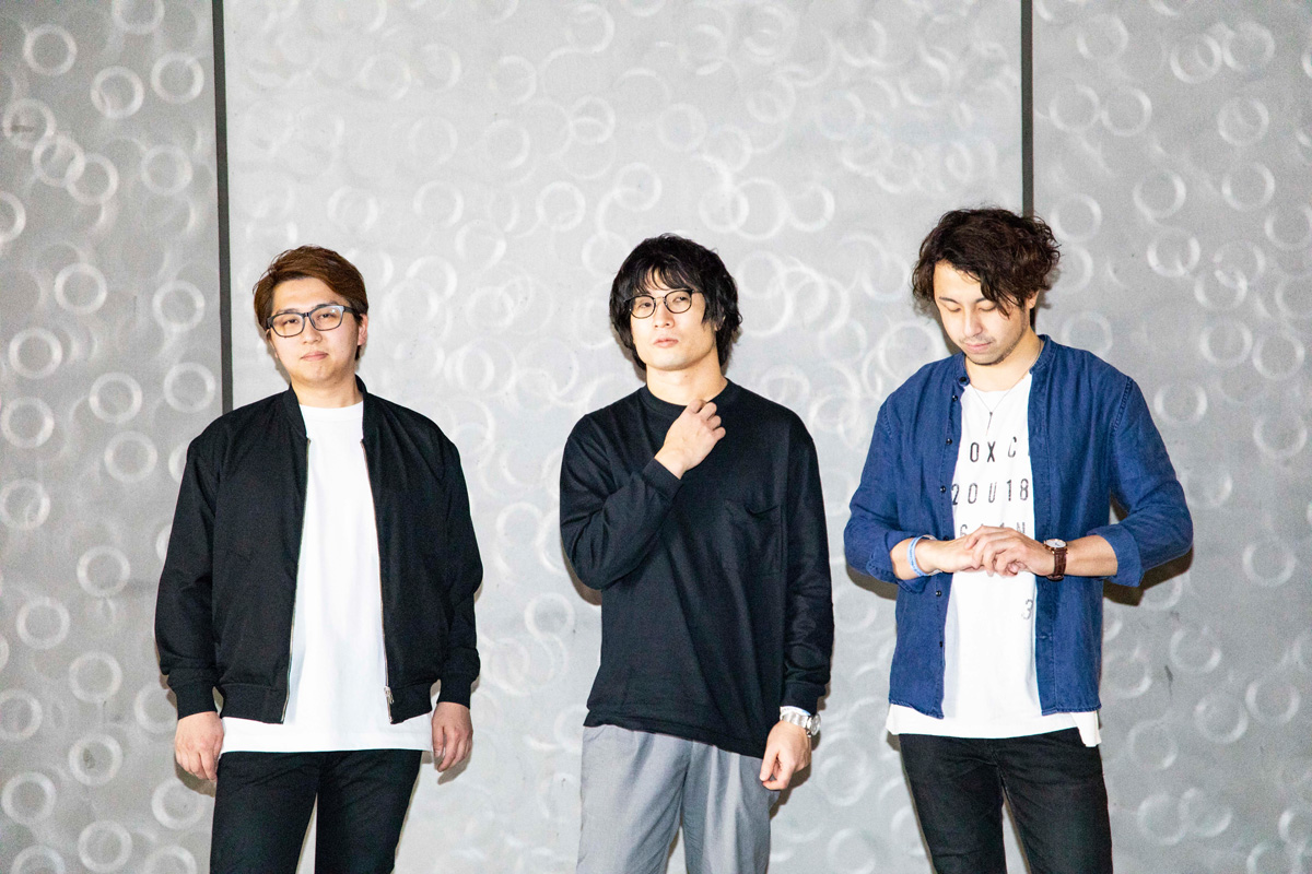 [L→R] カワイヒデヒロ(Ba.) / 岸本亮(Pf.) / 井上司(Dr.)