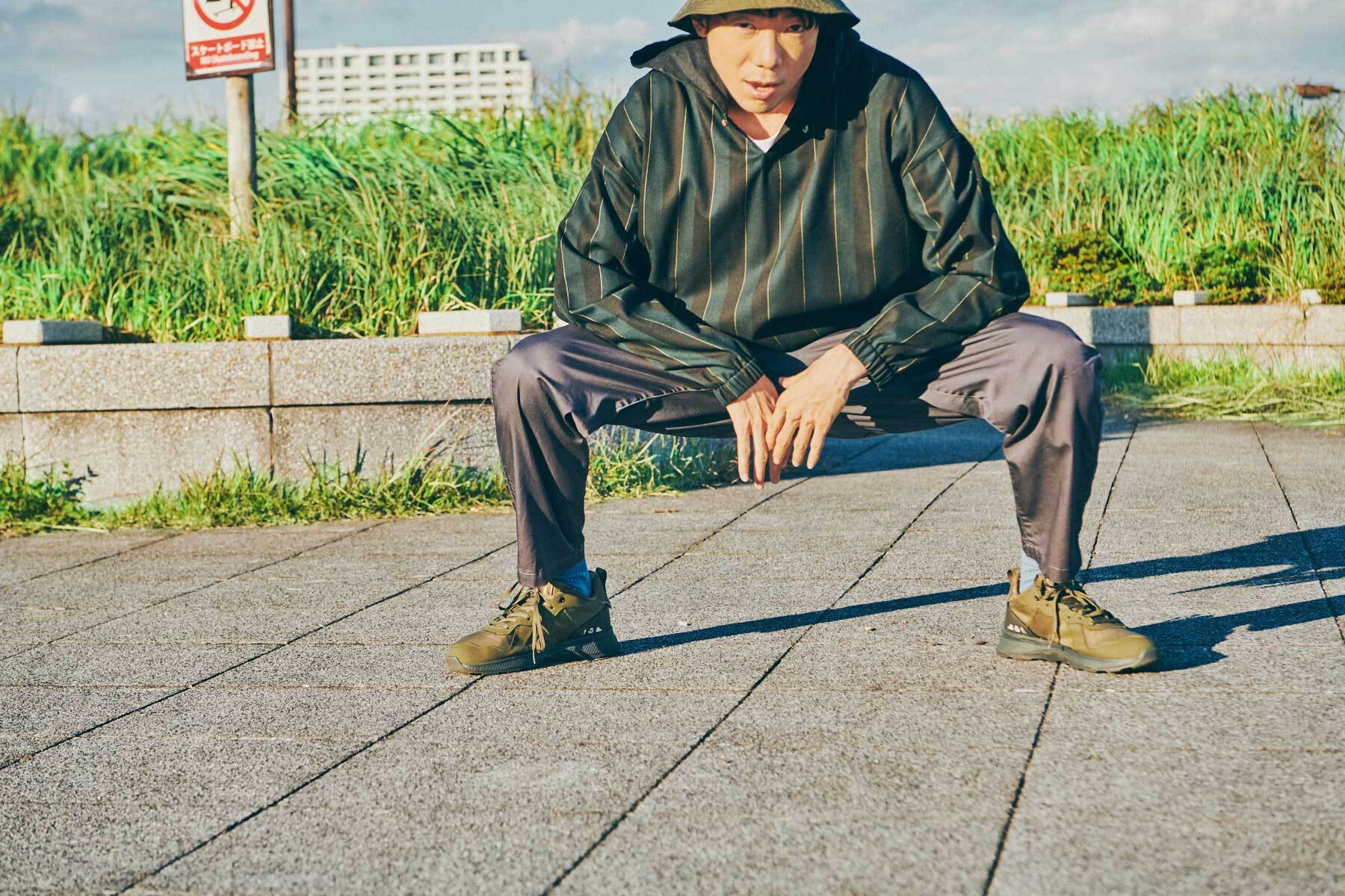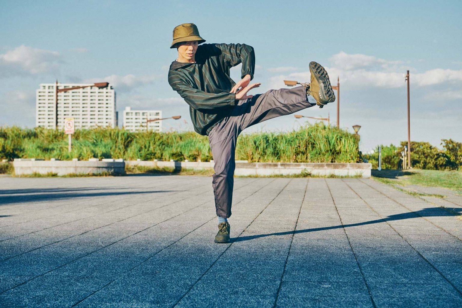 「パラディウムの防水でアクティブなスニーカーはダンサーにもオススメ出来るシューズだと思いました。デザインもカッコ良いですが、機能性に驚きました。汚れをすぐに水で洗い流せるのはダンサーにとって嬉しいですね!普段のスタイルでも、このカーキの同系色に合わせてコーディネートしたいです」