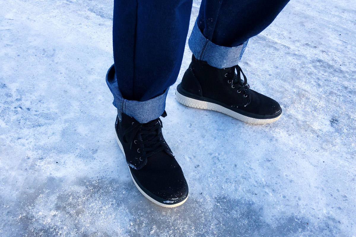 滑りやすいということも、特別グリップする感じも、どちらもしないかな。雪の深い場所に行く時は、ちゃんと暖かいブーツを履いてるから、それと比べるとなかなか難しい。