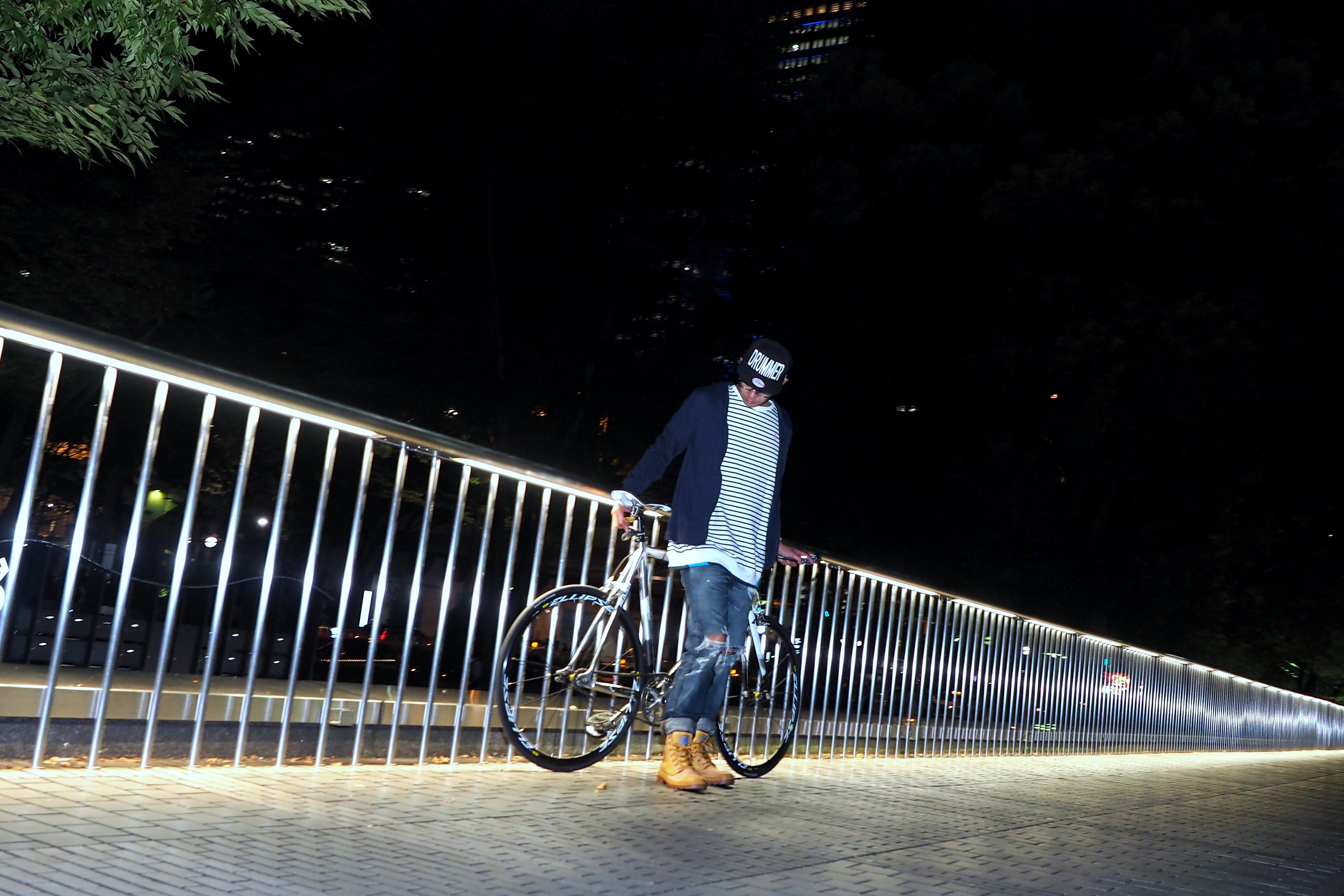 「普通の自転車とかマウンテンバイクなら平気だけど、僕が普段乗るピストバイクタイプにはあまりおすすめしないかな。パドルライトもスポーツカフもアウトソールがしっかりとブーツタイプだから、ピストバイクのペダル部分のペダルストラップに入りにくいし抜けにくい。ペダルのギザギザにソールの部分も引っかかりやすい感じがある」