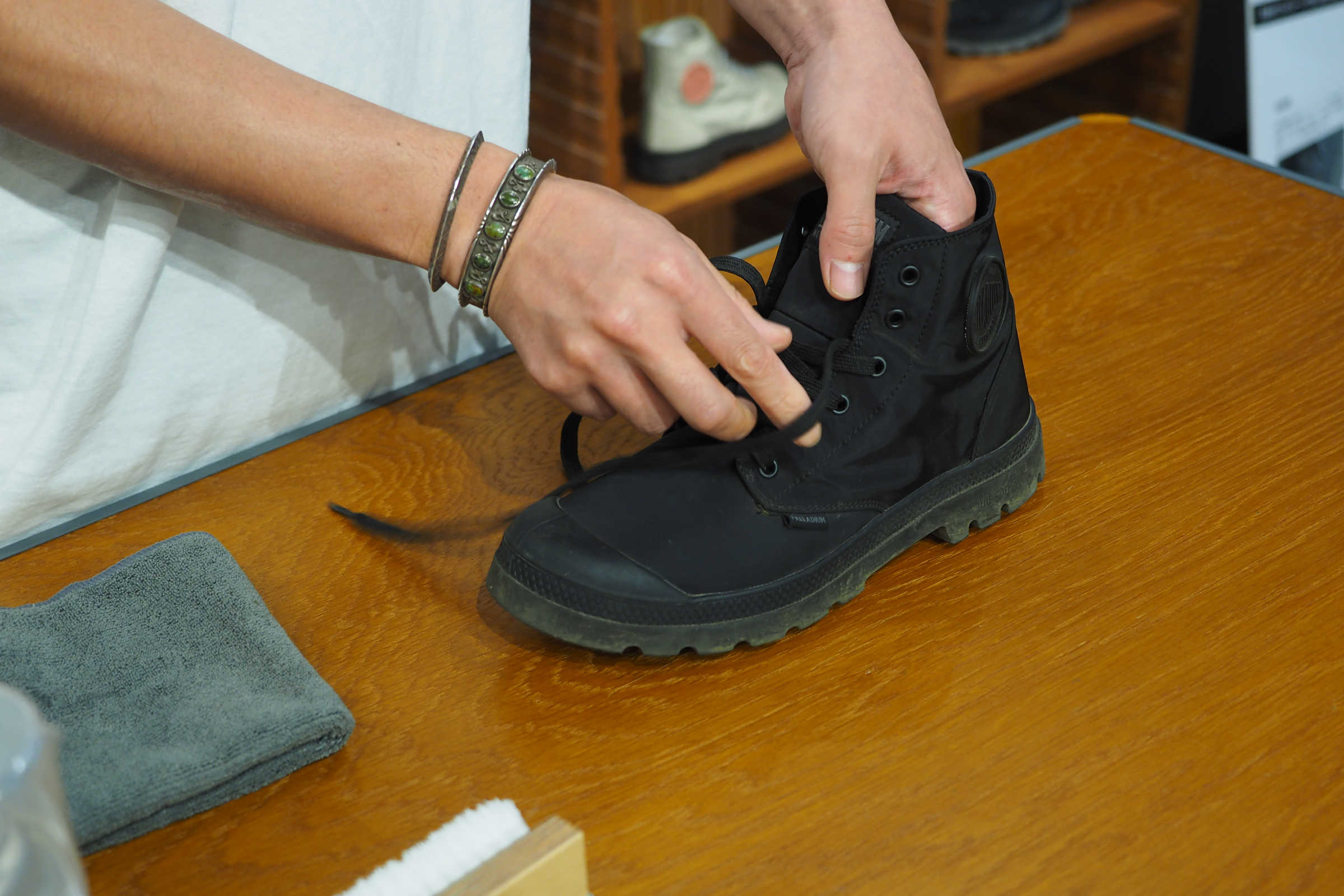 「まず、紐を外します。紐は単体でつけおき洗いをした方が綺麗になります。洗濯機で洗ってもオッケーです(ネットには入れてください)。乾いた後に、シューレースに撥水スプレーをかけるのもいいですね」