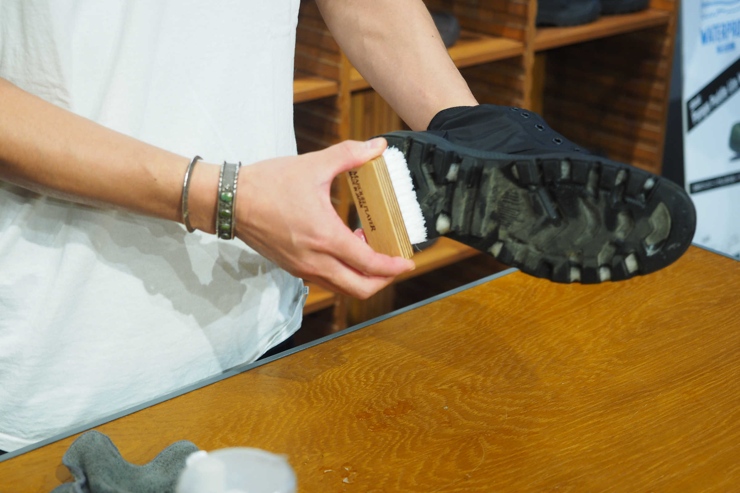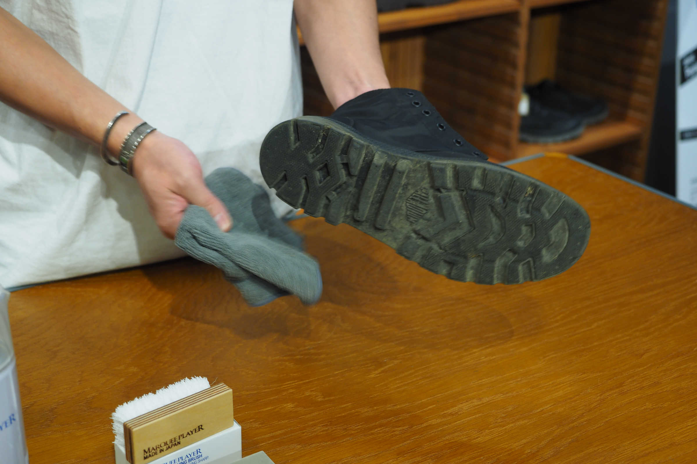 「アッパー表面のホコリを拭いてきれいにします。アウトソールに石が挟まっていないかもチェックしてください」