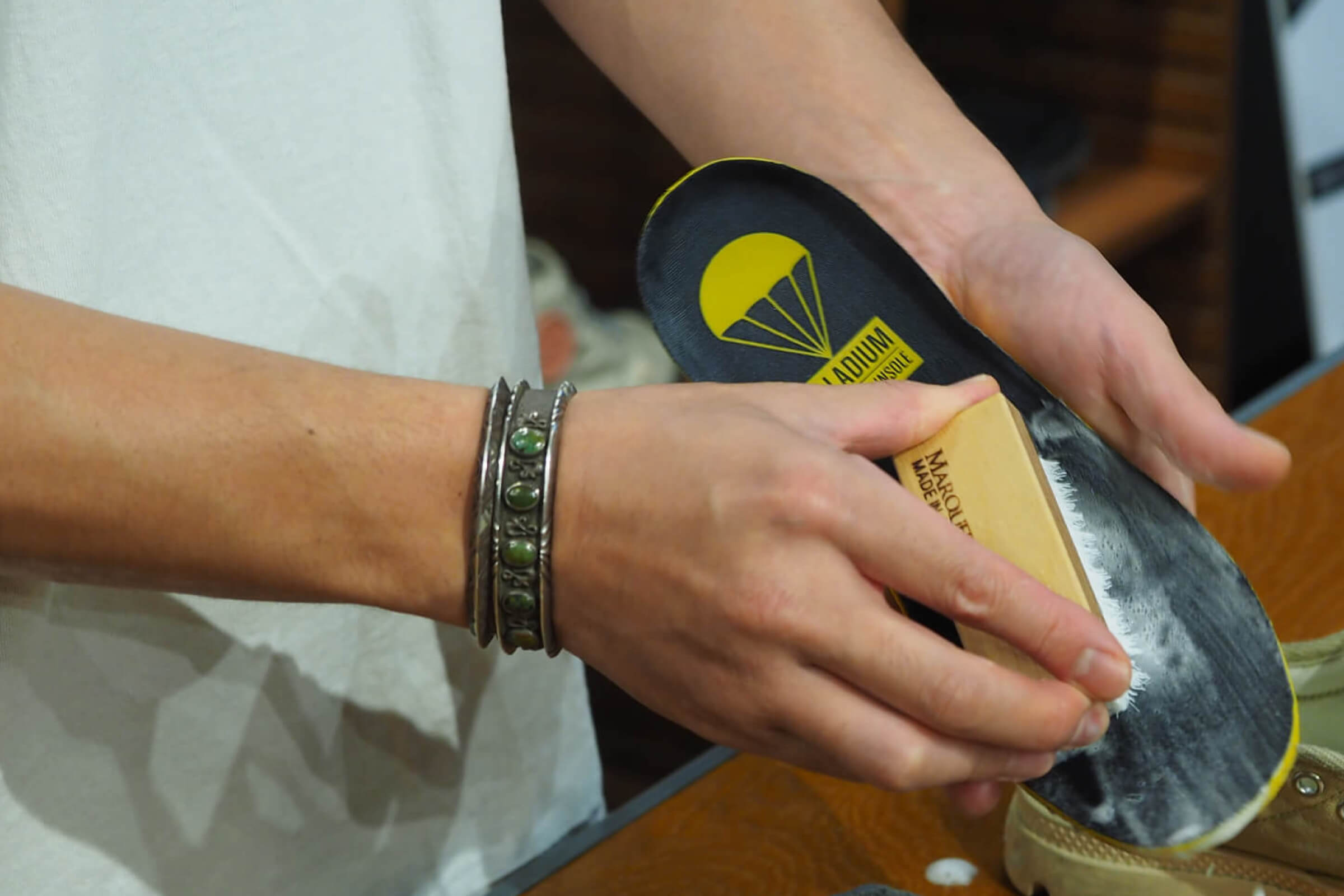 「インソールは、シューズから取り出してください。ブラッシングし、水で流します。インソールは足の菌が付いているから、水で流したほうが清潔になります」