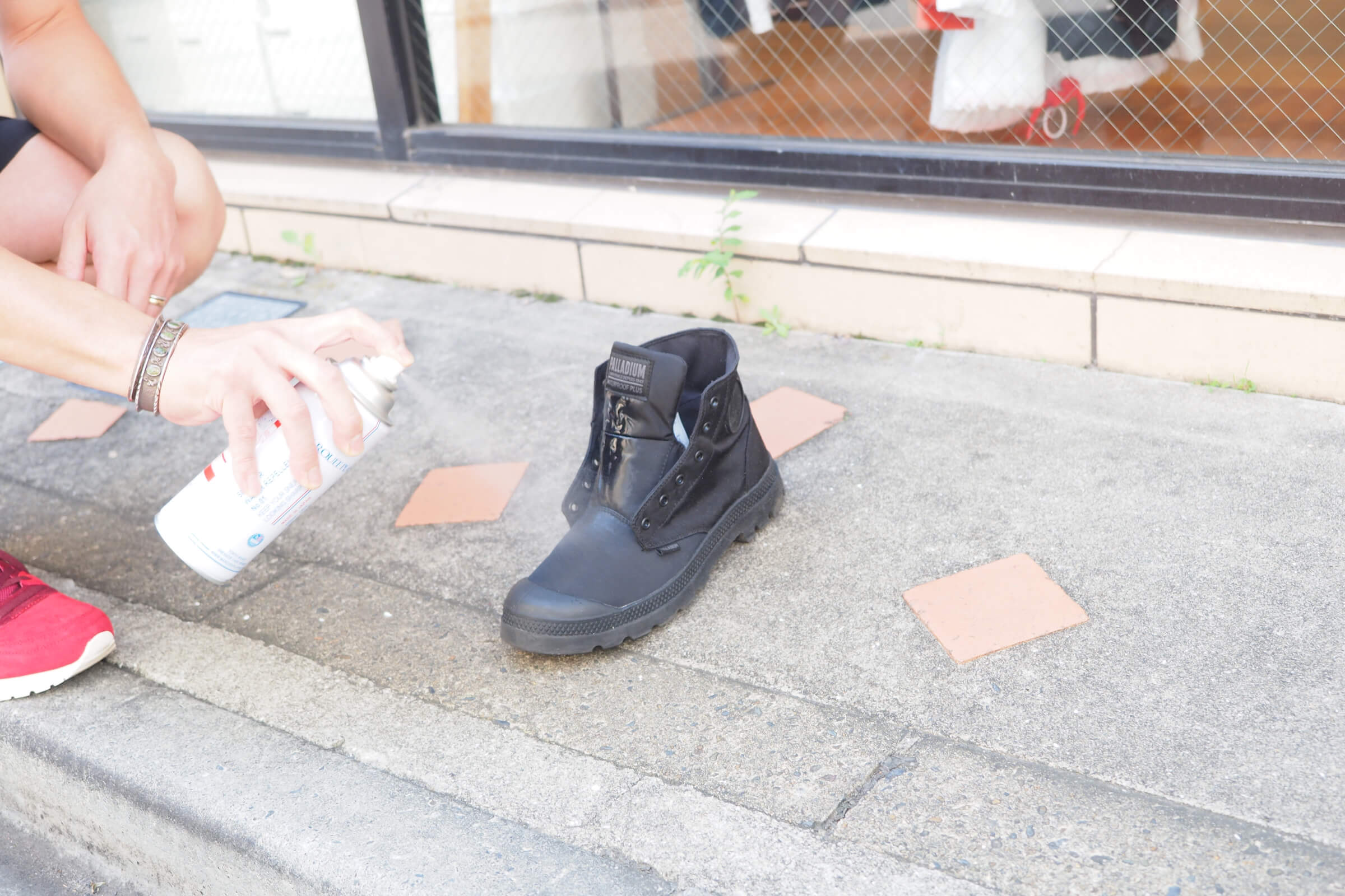 「スプレーは人体に有害ですので、必ず屋外で行なってください。手についたら石鹸でしっかりと洗うようにお願いします。20cm離れて、片足5秒ずつ。スプレーでの撥水効果は、3週間ほど続きます」