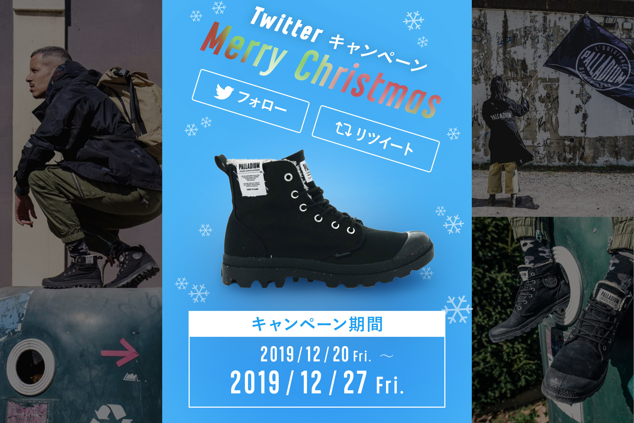 期間中、PALLADIUM公式のTwitterアカウントをフォローし、ご自身のTwitterアカウントから該当のツイートをRT(コメントを付けてリツイート)し、ご希望のサイズをコメントにご記載し投稿してください。