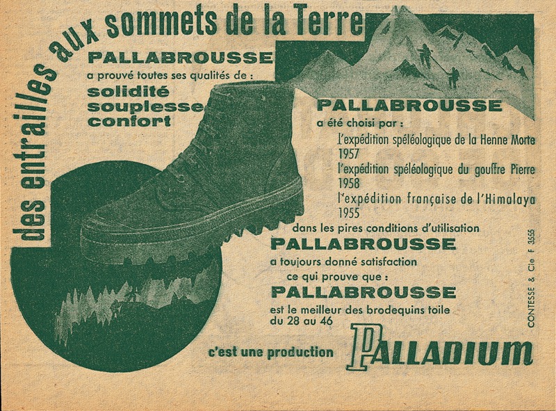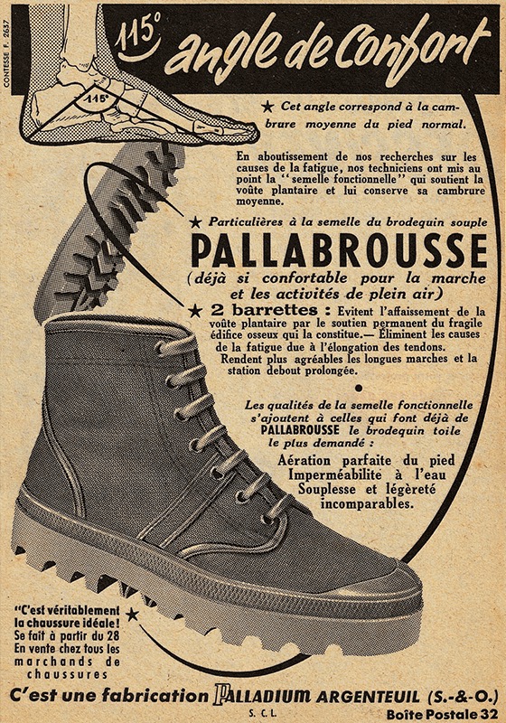 1960年代、フランスでは、レジャーとして旅行に脚光が当たり、キャンプやハイキングが人気になりました。パラディウムのパラブロウズブーツは、その耐久性により、フランス軍だけではなく、自然を愛し、郊外へと出かける家族にも愛用されるようになりました。
